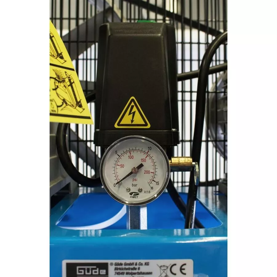 - Vybavení: 2 manometry, 2 výstupy tlakového vzduchu (→ na vzdušníku/u redukčního ventilu), tlakový spínač, redukční ventil, pojistný přetlakový ventil, zpětný ventil, dochlazovač, olejoznak, vzduchový filtr, 2 m přípojný elektrický kabel (→ zástrčka s měničem fází).Tlaková nádoba: 200 l, ventil pro vypouštění kondenzátu, široce otevřené opěrné nohy (3) s otvory pro montáž napevno