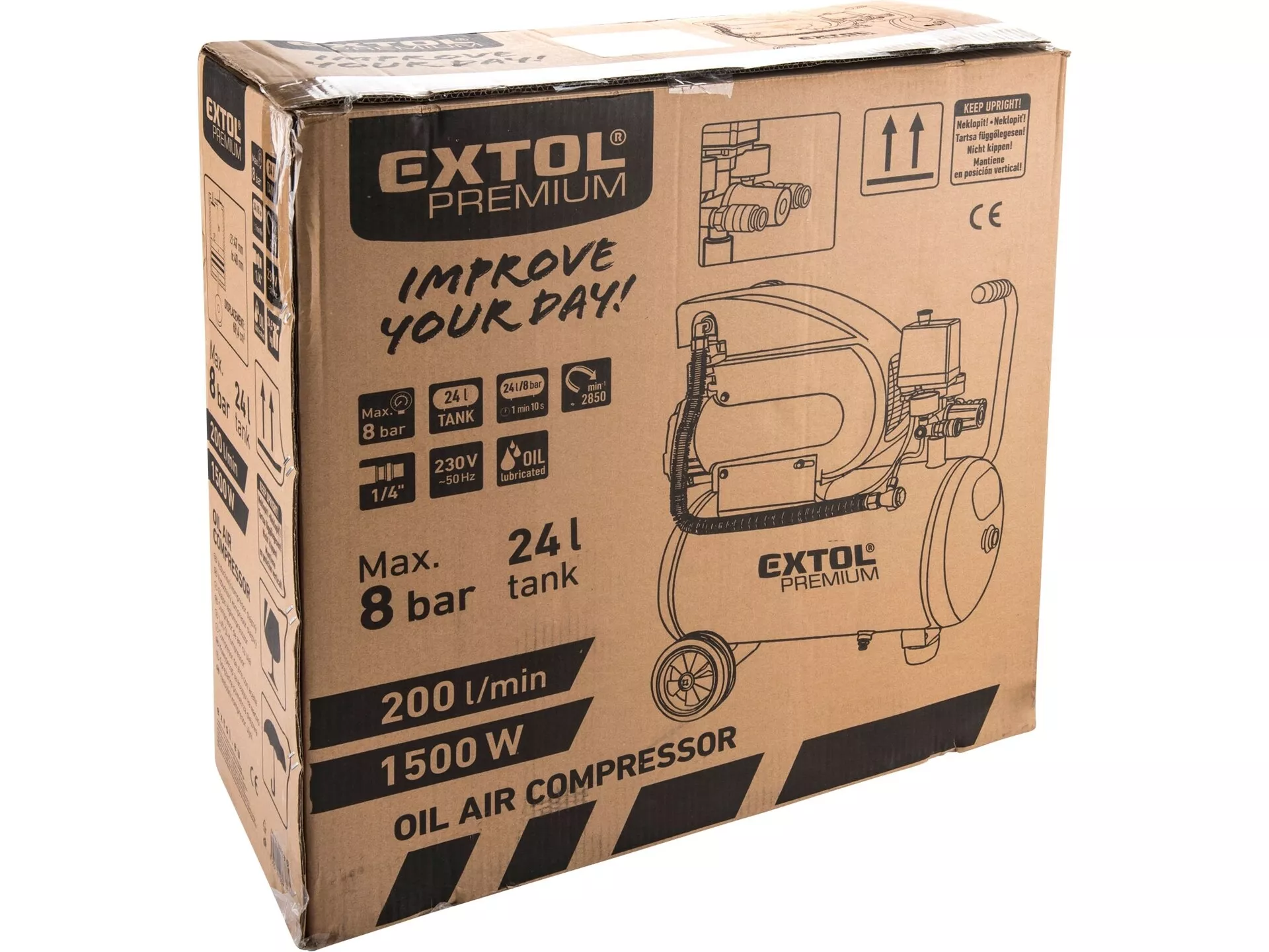 - Jednopístový olejový vzduchový kompresor s tlakovou nádobou o objemu 24l je určen k použití všude tam, kde je stlačeného vzduchu zapotřebí, tj. např. k nanášení barev stříkací pistolí, čištění tlakovým vzduchem ofukovací pistolí, pískování, olejování či mytí mlžící pistolí, plnění vzduchem plničem pneumatik, dále pro pohon pneumatického nářadí s ohledem na spotřebu vzduchu tímto nářadím a plnícím výkonem kompresoru apod.. Vyrovnaný vysoký výstupní tlak 8bar a sací výkon 200l/min umožňuje pohánět širokou škálu pneumatického nářadí. Kompresor je vybaven dvěma manometry. Na jednom manometru se zobrazuje hodnota tlaku v nádrži a na druhém je výstupní tlak. Pomocí regulačního ventilu lze tento výstupní tlak přesně nastavit. Abychom zvýšili životnost stroje, používáme na vstupu vzduchu odolné kovové filtry. Konstrukční řešení umožňující mazání olejem zaručuje vyšší výkonnost a delší životnost stroje. Na nádrži je ventil pro vypuštění kondenzátu. Snadnou manipulaci s kompresorem zajišťují kolečka a pevná rukojeť.