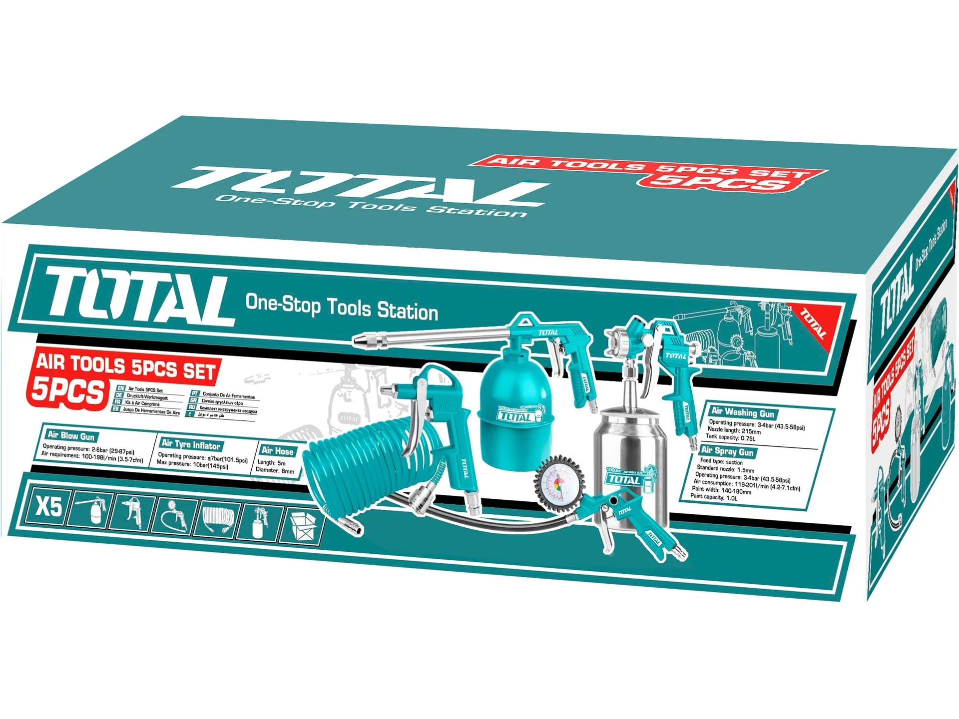 - Doplňující parametr: Délka vzduchové spirálové hadice 5m, průměr 8mm, pistole ofukovací, pistole stříkací se spodní nádobkou, plnič pneumatik s manometrem, pistole mycí