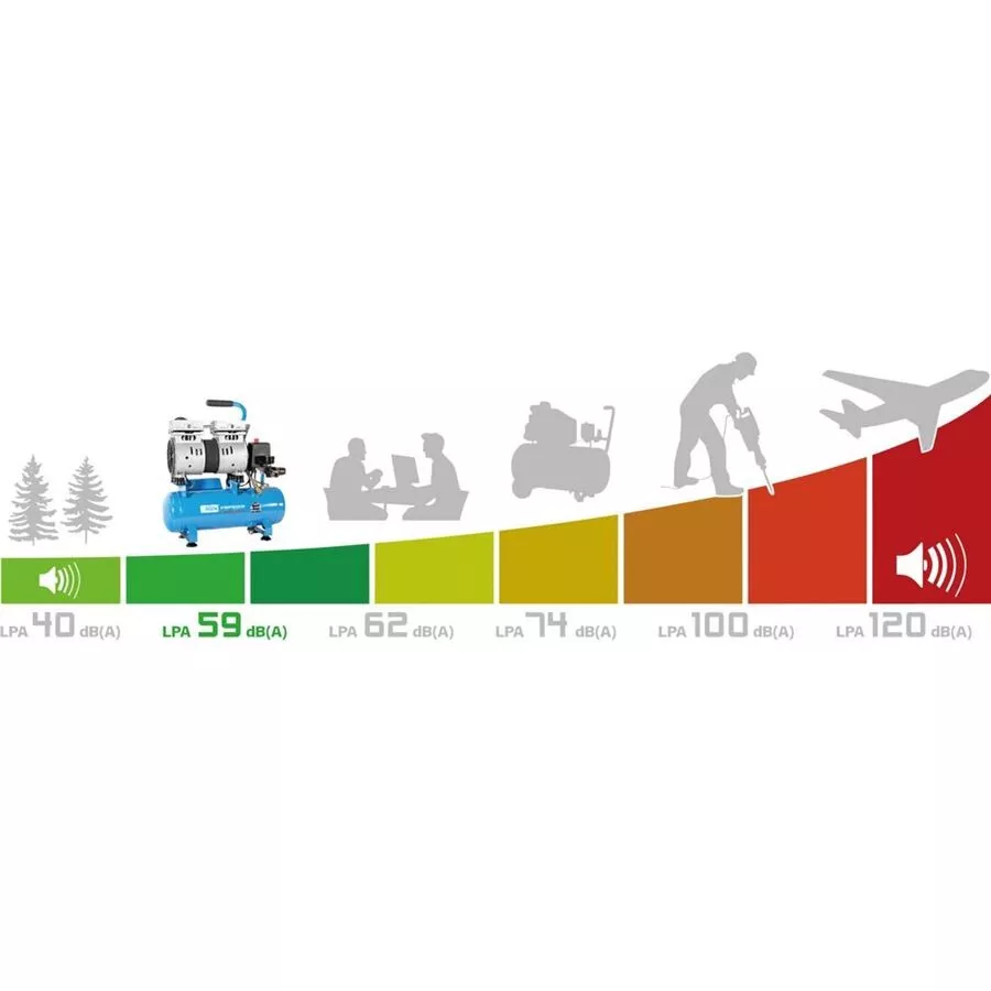 - • nastřelení spon a hřebíků • nanášení laků (barev) technikou AIRBRUSH.SILENT - hladina akustického výkonu LWA: 59 dB (A), odpovídající prostředí *manikérských (pedikérských) studií, kosmetických salonů (dočasná tetování AIRBRUSH TATTOOS) atp.Konstrukce: elektromotor 550 W (indukční, typ provozu: S3/50%), dvouválcový samomazný agregát, přímý pohon (motor s agregátem na společné hřídeli).Vybavení: manometr (měření pracovního tlaku), 1 výstup stlačeného vzduchu (kovová rychlospojka), tlakový spínač, redukční ventil, pojistný přetlakový ventil, přepravní držadlo.Tlaková nádoba: 6 l, ventil pro vypouštění kondenzátu, opěrné nožky s tlumicími gumovými patkami.Celkové rozměry (d x š x v): 420 x 200 x 500 mm, stupeň krytí: IP 20.