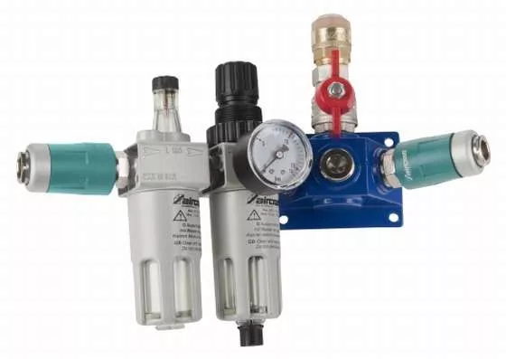 - 1 x rozdělovací krabice, 2 x bezpečnostní rychlospojka 1/2"AG, 1 x záslepka 1/2", 1 x spojka 1/4" AG, 1 x kulový ventil 1/2"AG x 1/2"IG, 1 x regulátor tlaku s filtrem 1/4", 1 x olejový přimazávač 1/4",1 x zástrčková spojka AD 22 mosaz