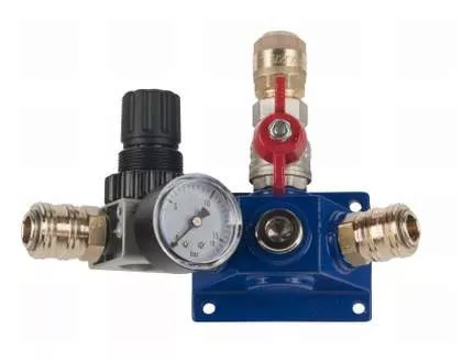 - 1 x rozdělovací krabice, 2 x rychlospojka 1/2"AG, 1 x záslepka 1/2", 1 x spojka 1/4" AG, 1 x kulový ventil 1/2"AG x 1/2"IG, 1 x regulátor tlaku s filtrem 1/4", 1 x olejový přimazávač 1/4",1 x zástrčková spojka AD 22 mosaz