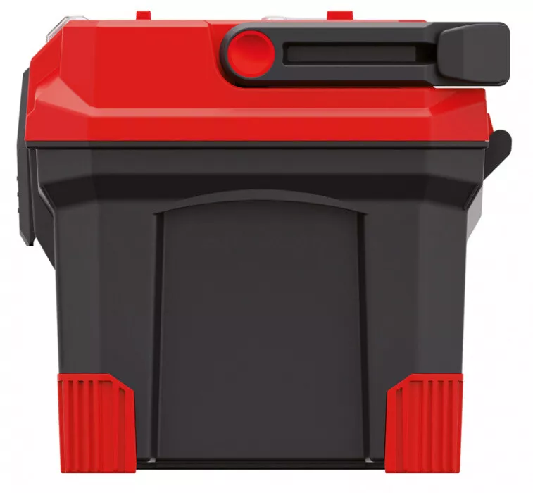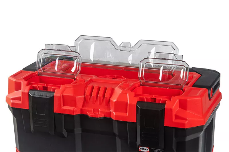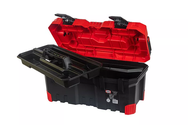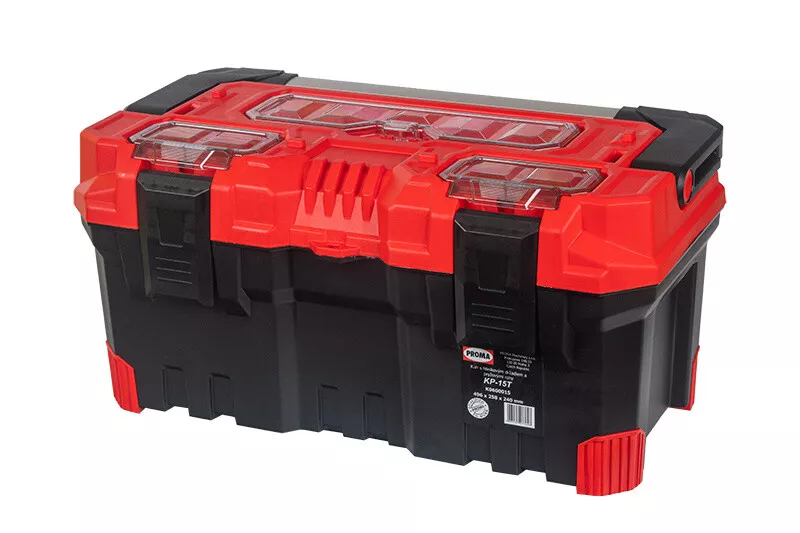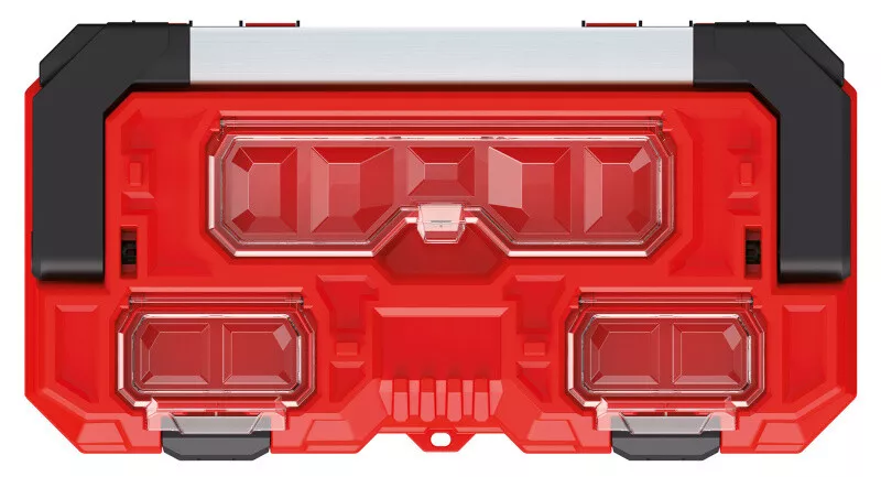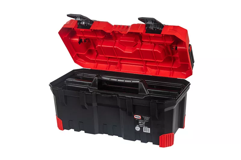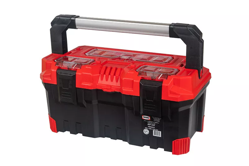 - Plastový kufr na nářadí s hliníkovým držadlem a pryžovou ochranou rohů.