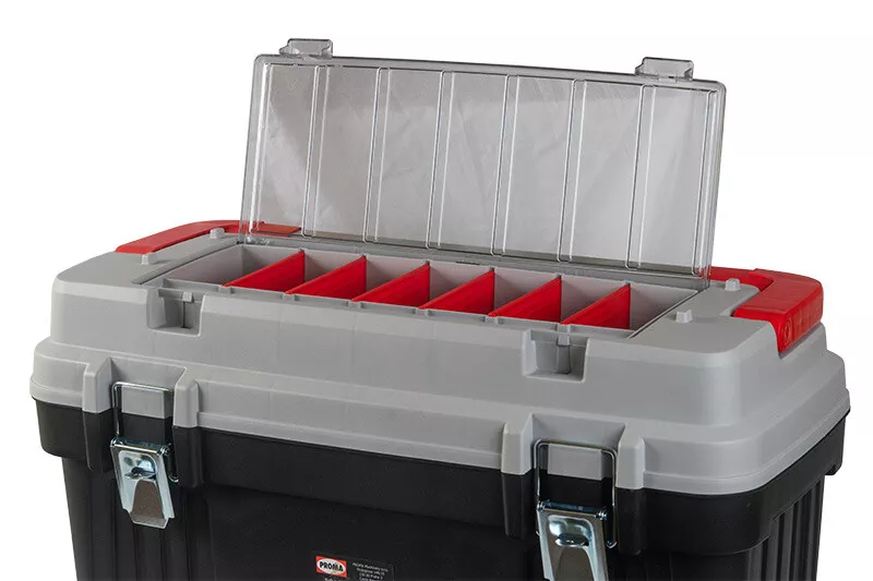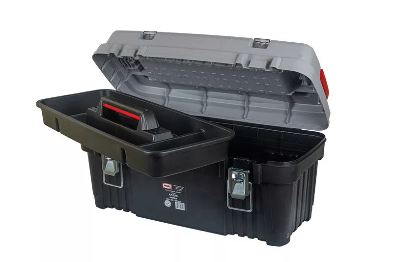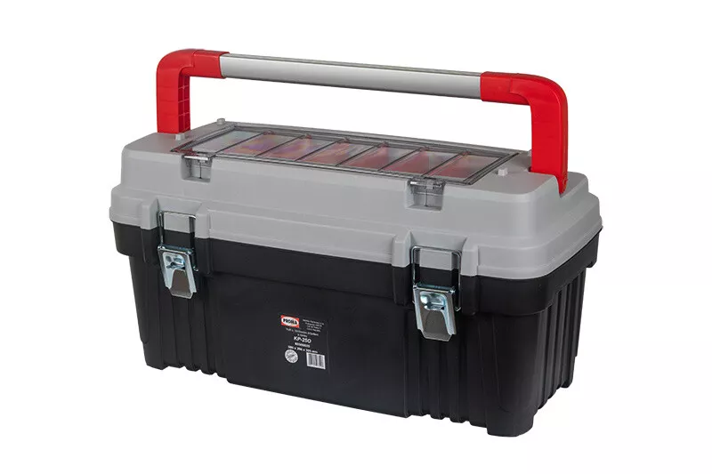 - Plastový kufr na nářadí s hliníkovým držadlem a možností uzamčení ve víku prostor s 7 přihrádkami pro uložení drobnějších věcí vyjímatelná vnitřní polička se 4 otevřenými přihrádkami hliníkové držadlo kufru kovové zavírací spony s možností uzamčení (zámek není součást balení)