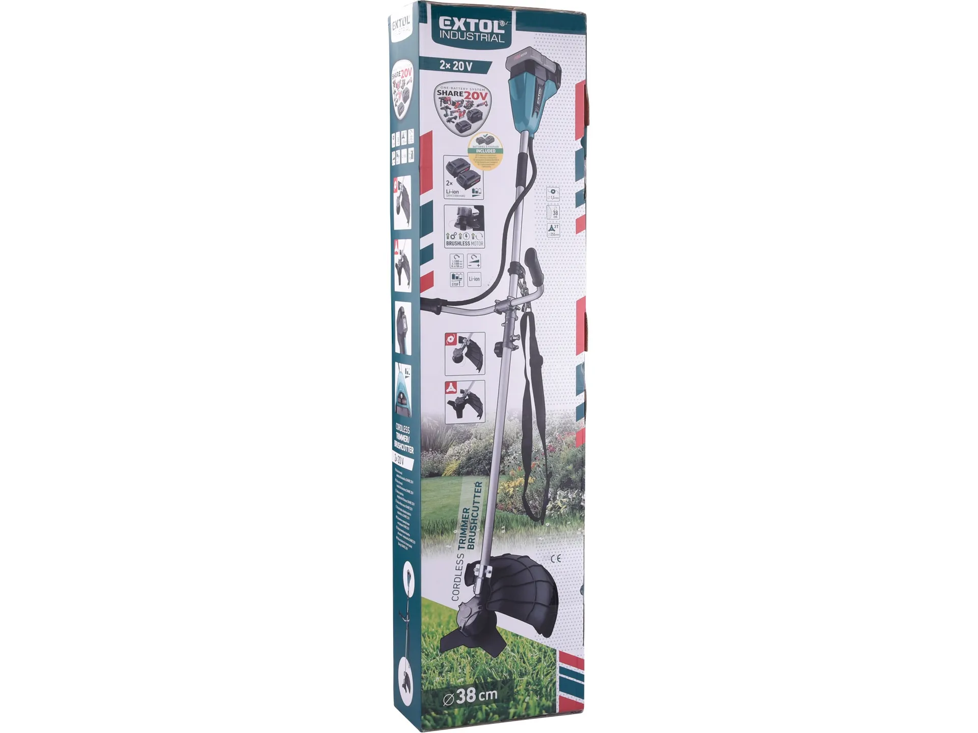 - Silný aku křovinořez určený k sekání vysoké trávy nebo suché trávy, vysokých kopřiv a keřů a podrostu s průměrem kmene až 4cm s pomocí ocelového žacího nože nebo k sekání nižší trávy pomocí žací struny. Pro snadnou manipulaci při sekání má křovinořez ergonomicky tvarované rukojeti ve tvaru cyklořídítek a ramenní popruh, který přenáší většinu hmotnosti na tělo a ruce používáte jen pro jemnou manipulaci při sekání. Křovinořez je poháněn nejmodernějším „brushless” motorem. Tento nový typ motoru má vyšší životnost, je výkonnější a má menší spotřebu el. energie než klasické motory s uhlíkovými kartáči. Díky malé velikosti a při zachování vysokého výkonu je možné motor umístit do hlavy sekačky a díky tomu je v dlouhé tyči sekačky jen kabel, což umožňuje výrazně snížit vibrace a zvýšit efektivitu motoru. Do stroje se vkládají dvě baterie SHARE20V, které společně umožňují motoru mít vysoký výkon i při zatížení. Při použití žací struny ji lze při práci prodloužit poklepem na zem. Na rukojeti je snadno přístupné tlačítko pro zapnutí a regulaci otáček ve 3 stupních: 3800/5000/6700 otáček/min. Dále jsou tam umístněné bezpečnostní tlačítka zabraňující náhodnému spuštění stroje při manipulaci. Pro snadnou přepravu lze křovinořez jednoduše “rozpůlit” bez nástroje pomocí jednoho šroubu. Pro běžnou práci dostačují dva 2Ah akumulátory, oba dva můžete najednou rychle nabít v rychlonabíječce za 35min, pro náročnější nebo delší práci doporučujeme větší akumulátory s kapacitou 4–8Ah. Akumulátory lze použít ve všech typech nářadí řady EXTOL SHARE20V. Díky použité Li-ion technologii je ho možné kdykoliv dobíjet, aniž by se tím snižovala jeho kapacita. Li-ion akumulátor ztrácí energii vlivem samovybíjení velmi pomalu a vydrží dlouho nabitý a připravený k použití.