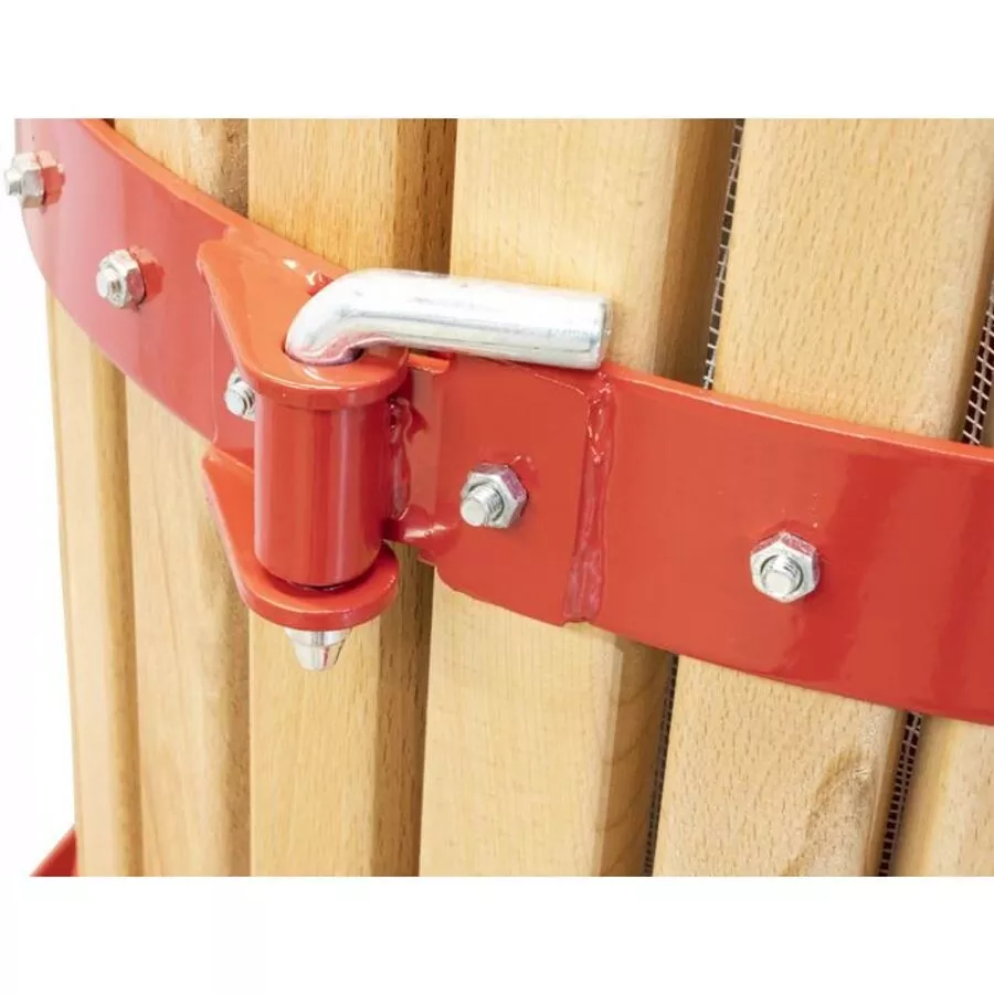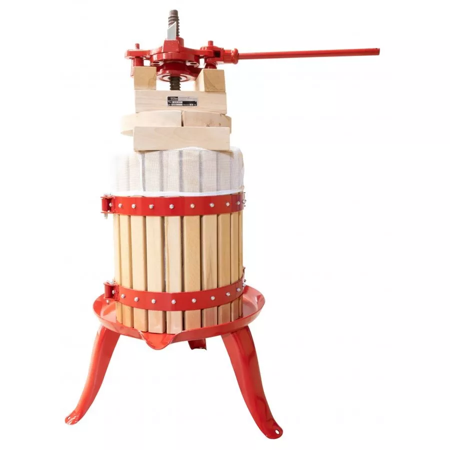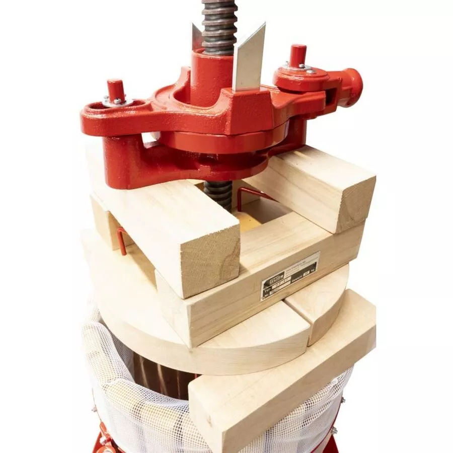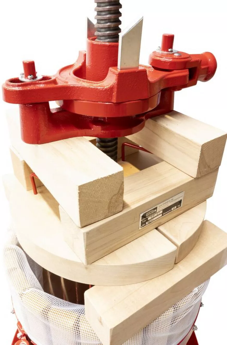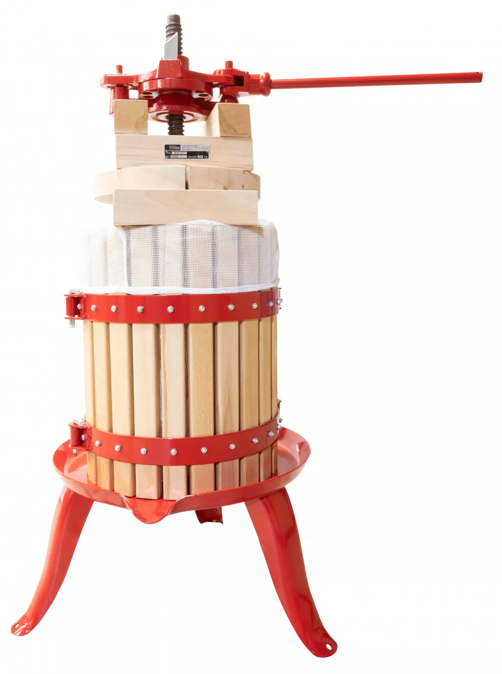 - Konstrukce: robustní ocelové vřeteno, lisovací koš z bukového dřeva, lakovaná sběrací miska (průměr: 540 mm), základna vč