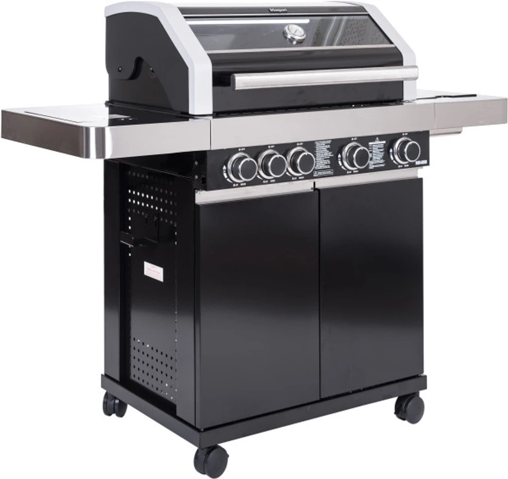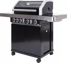 - Základem grilu jsou 4 vysoce kvalitní plynové hořáky z ušlechtilé oceli č. 304. Integrované zapalování odvádí spolehlivě svojí práci. Pro provoz grilu je vhodná plynová bomba velikosti 5 kg, která se snadno vmístí do skříňky pod grilem. Díky poklopu vybavenému teploměrem a skleněným okénkem můžete přípravu vašich pokrmů kdykoliv kontrolovat. Rošt i grilovací tál jsou opatřeny smaltovanou povrchovou úpravou, která zaručuje velmi dlouhou životnost. Na levé straně grilu se nachází přídavný hořák, vhodný pro přípravu omáček nebo udržení hotových pokrmů v ideální teplotě. Na pravé straně potom najdeme vyjímatelné krájecí prkénko a nerezovou odkládací misku. Plynová láhev je uzavřena ve spodní skříňce. Transport grilu výrazně ulehčí pojezdová kolečka s možností aretace. Gril je standardně dodáván s UV odolným krycím potahem.