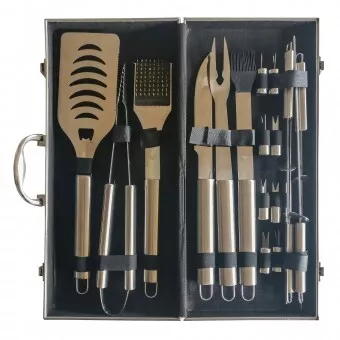 - Sada příslušenství (12 ks) Na grilování (gril) z nerezové oceli v ušlechtilém kufru se smyčkami na suchý zip a gumovými poutky pro přesnou fixaci. Sada se skládá z: 1ks. kleště na grilování, 1ks. vidličky na gril, 1 kus. míchadlo, 1x nůž, 4x držák kukuřice, 4x špejle.