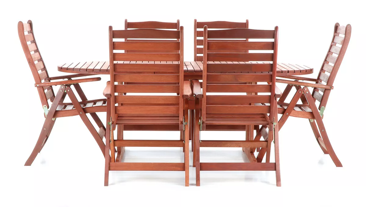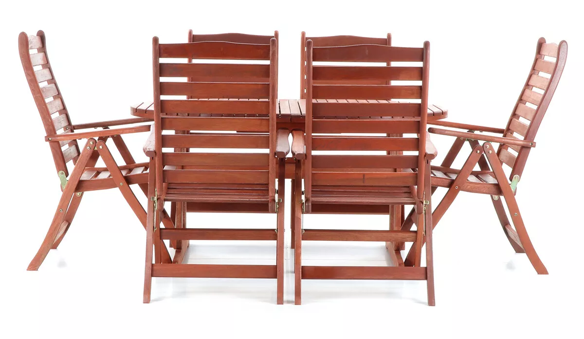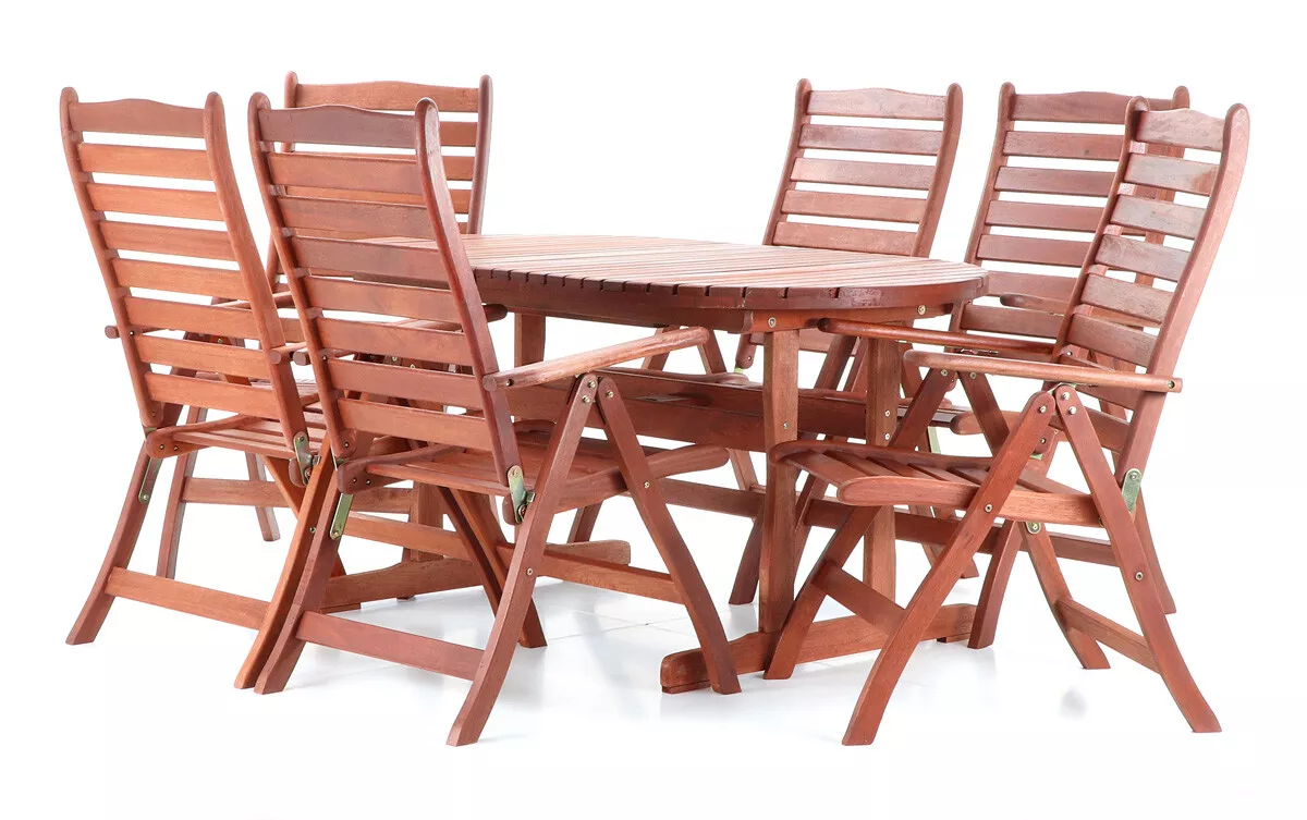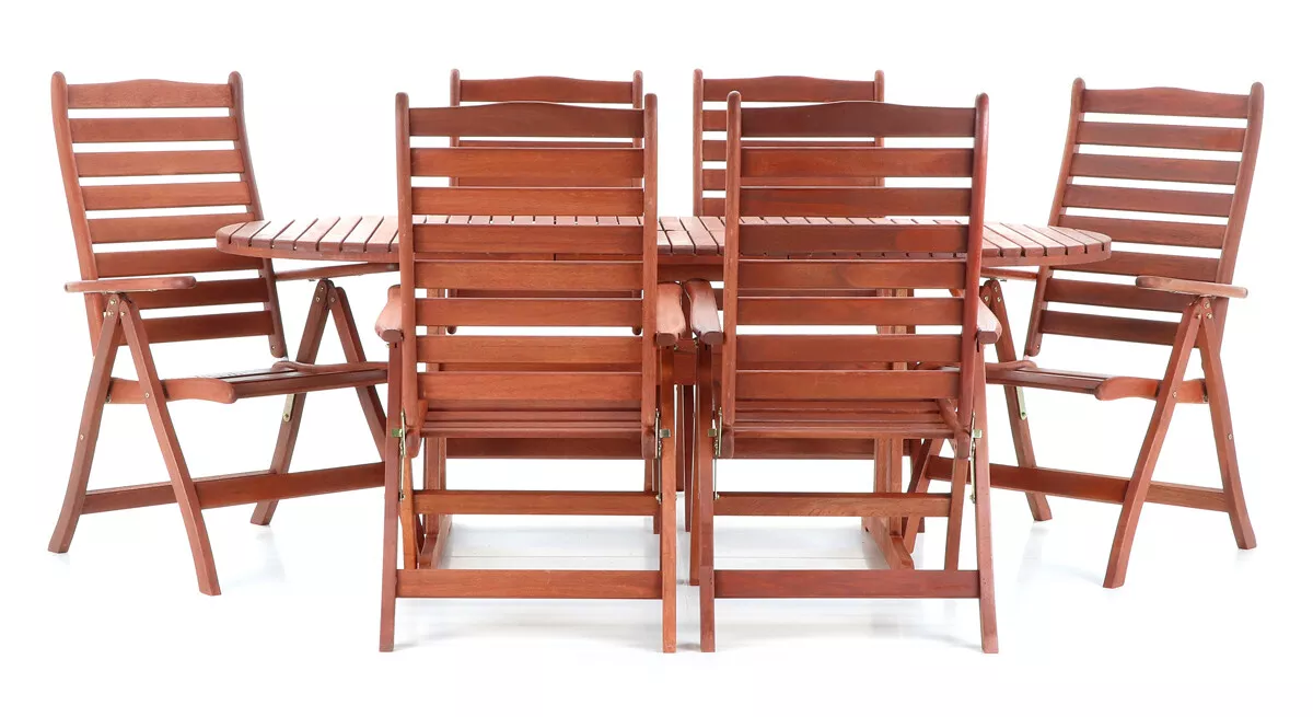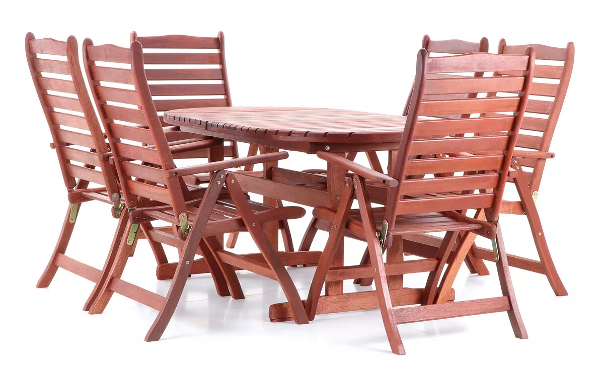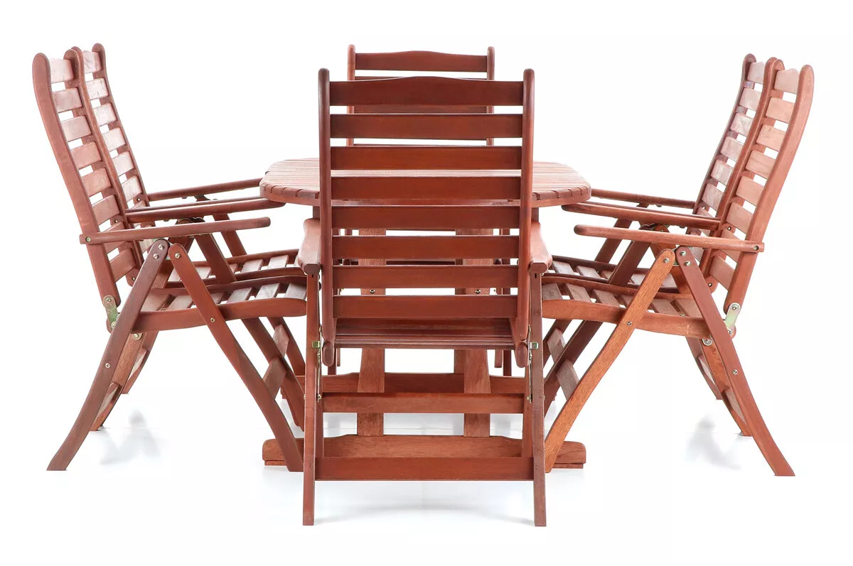 - Luxusní masivní stolová sestava 6-ti polohovatelných křesel a rozkládacího stolu z exotickeko, velice trvanlivého a tvrdého dřeva meranti.