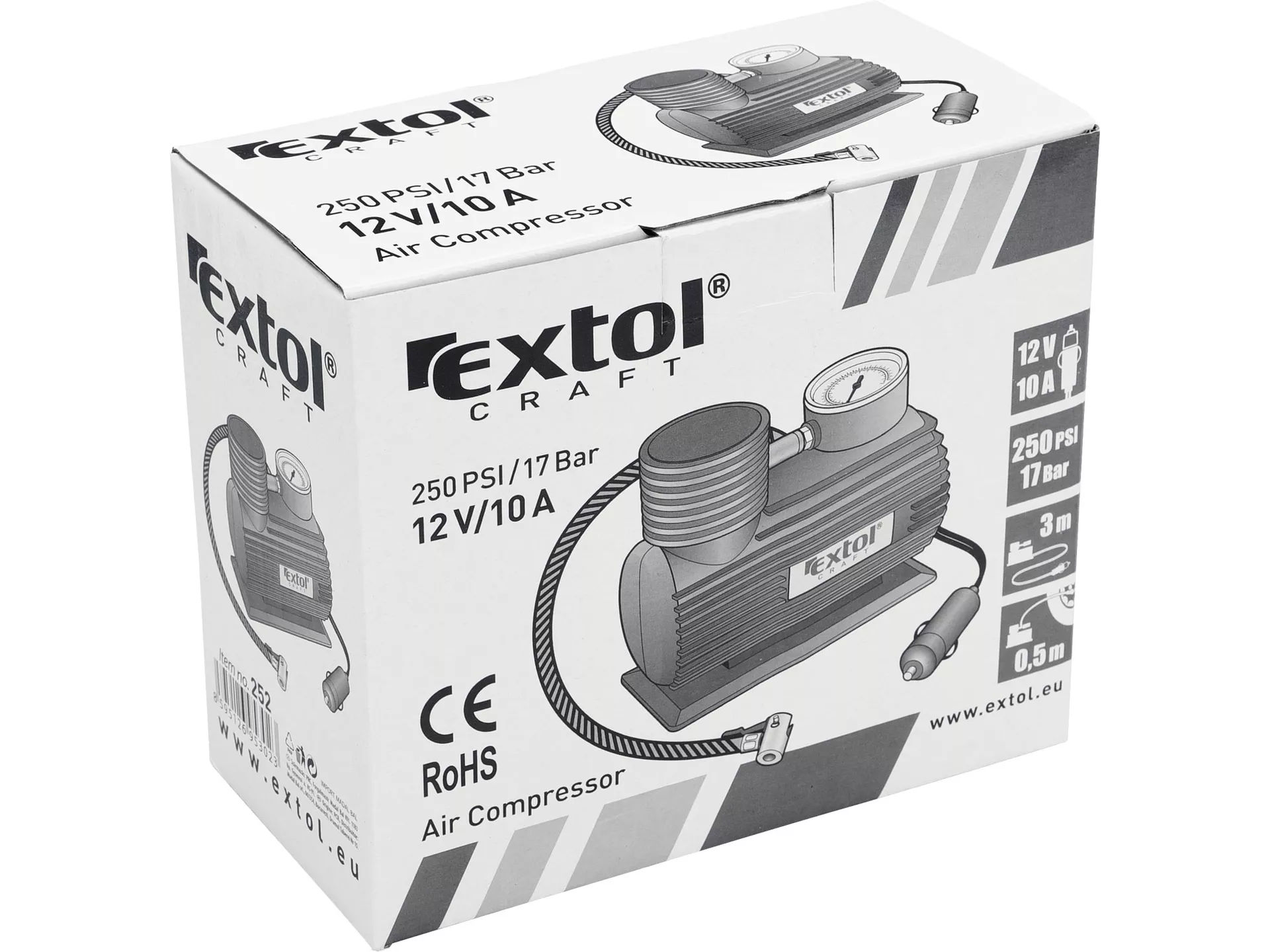 - Doplňující parametr: manometr 250PSI/1,7MPa, délka napájecího kabelu 3m,připojení do autozásuvky 12V, vzduchová hadička 0,5m, 3 typy koncovek, CE