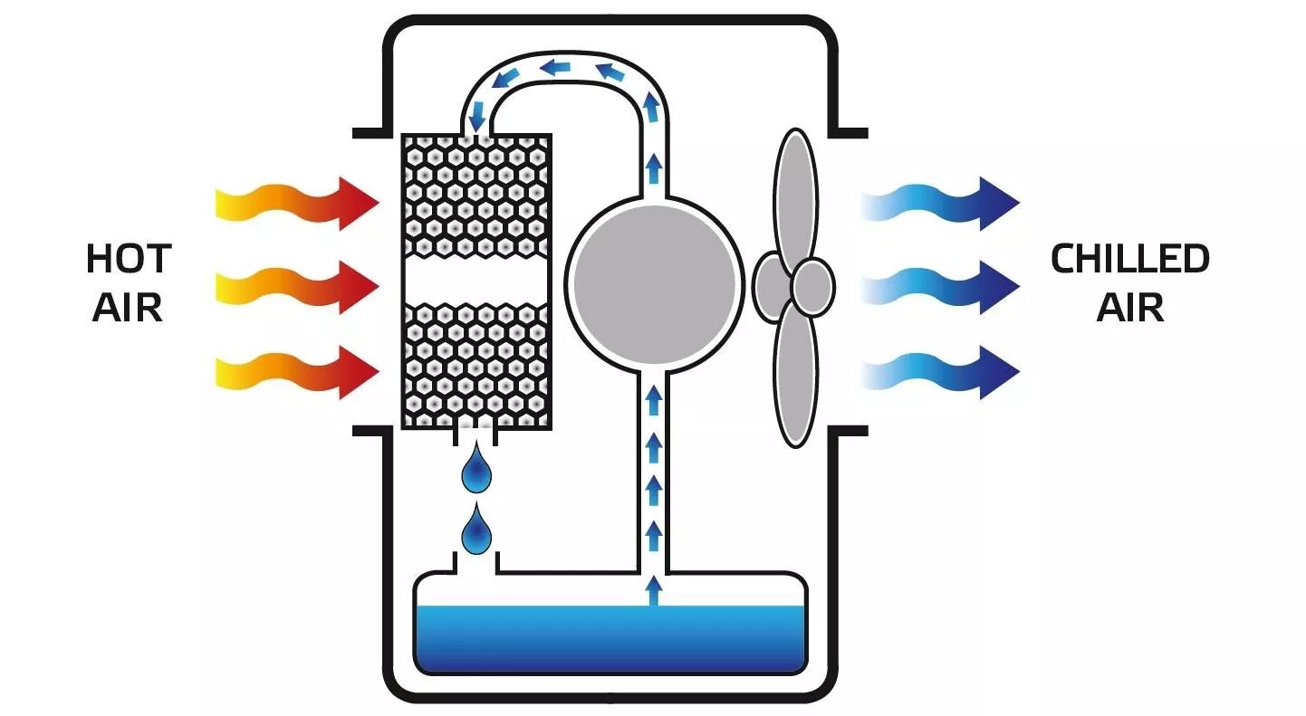 - Ochlazuje vzduch s využitím jednoduchého a přirozeného procesu odpařování vody a je šetrný k životnímu pristředí a velmi energeticky úsporný