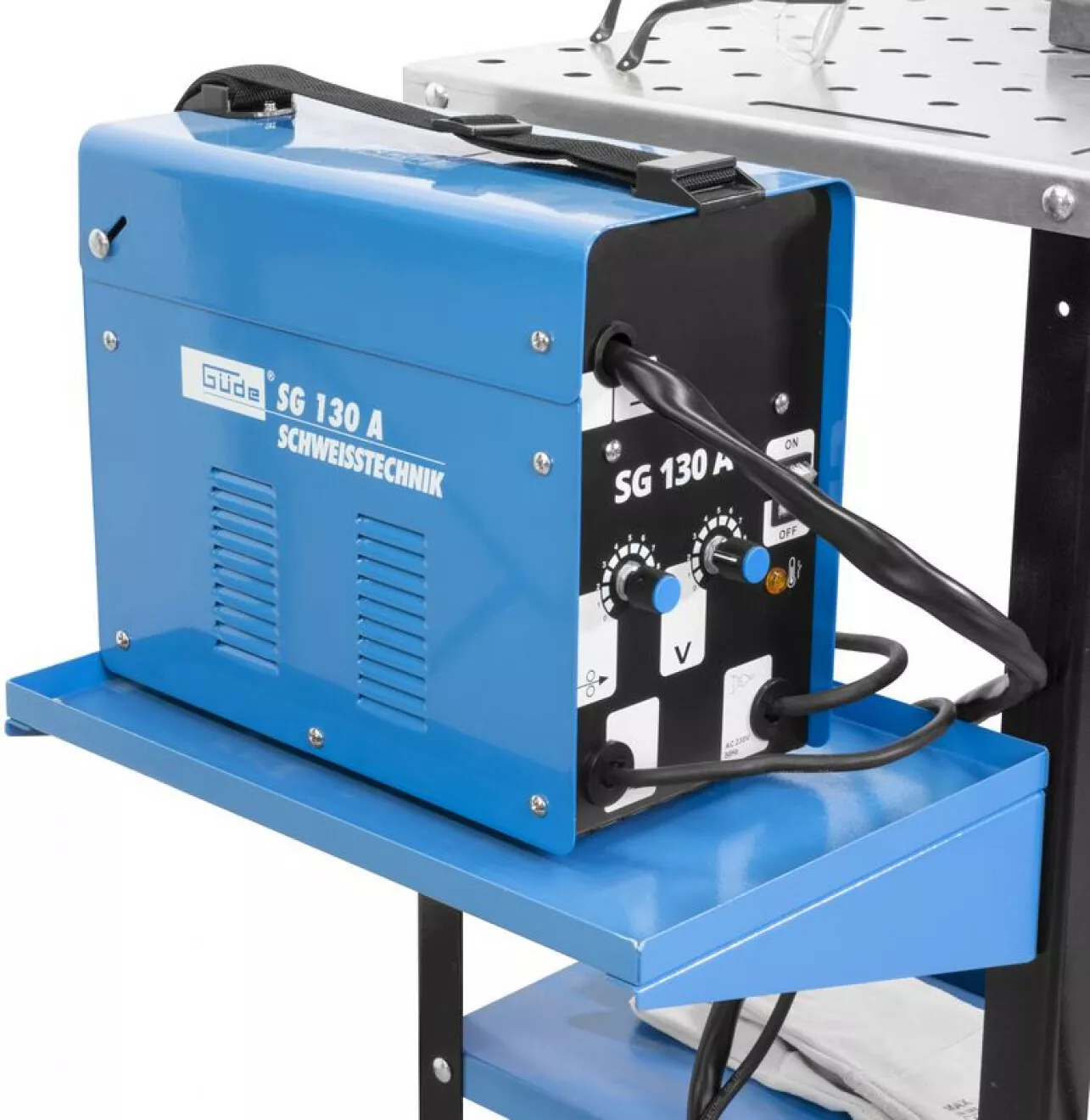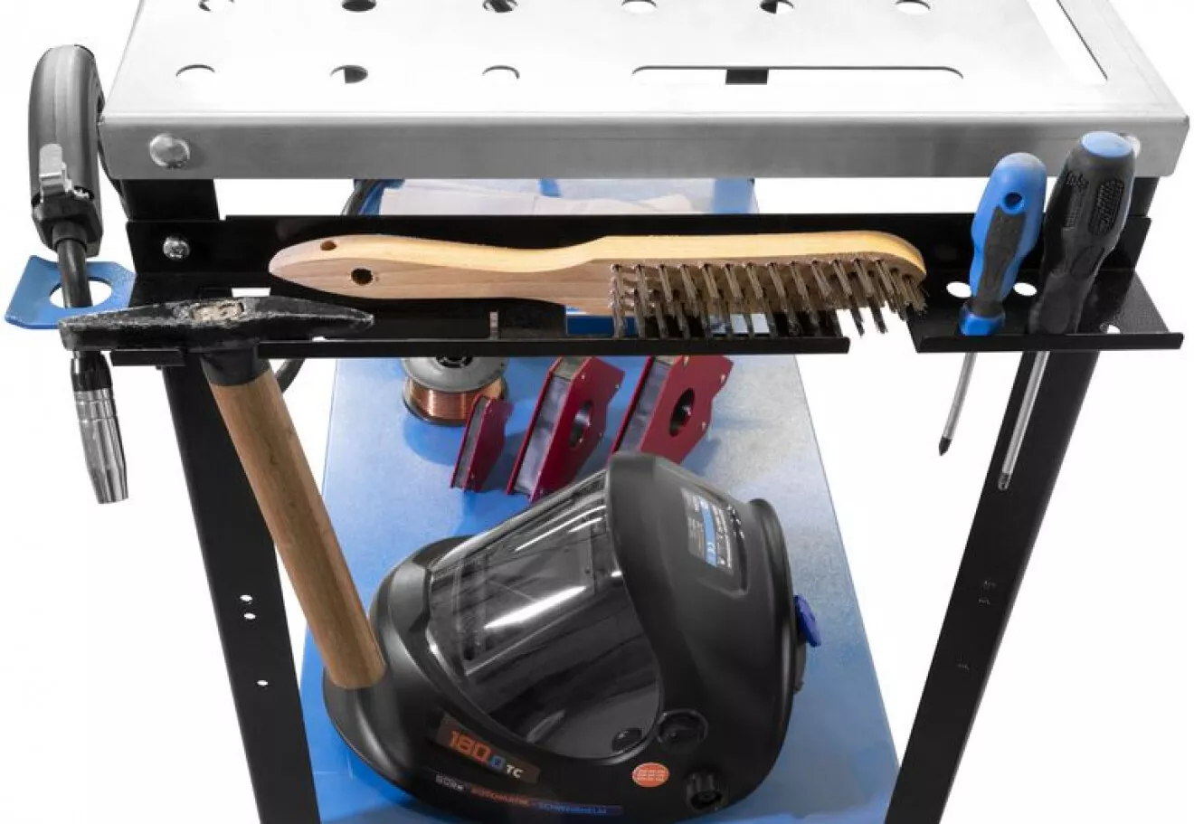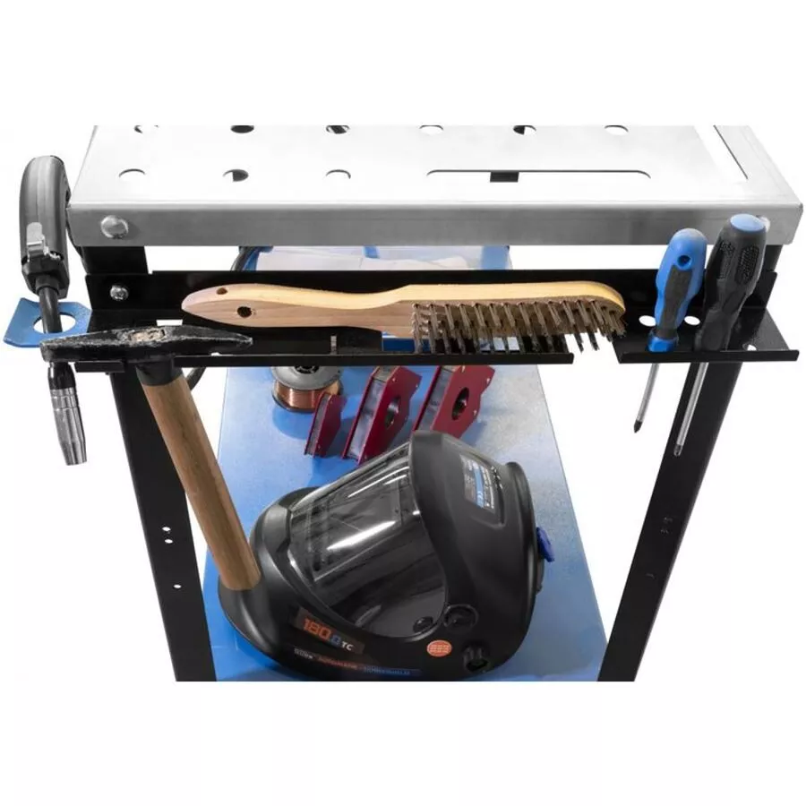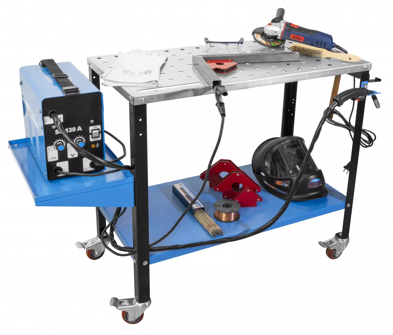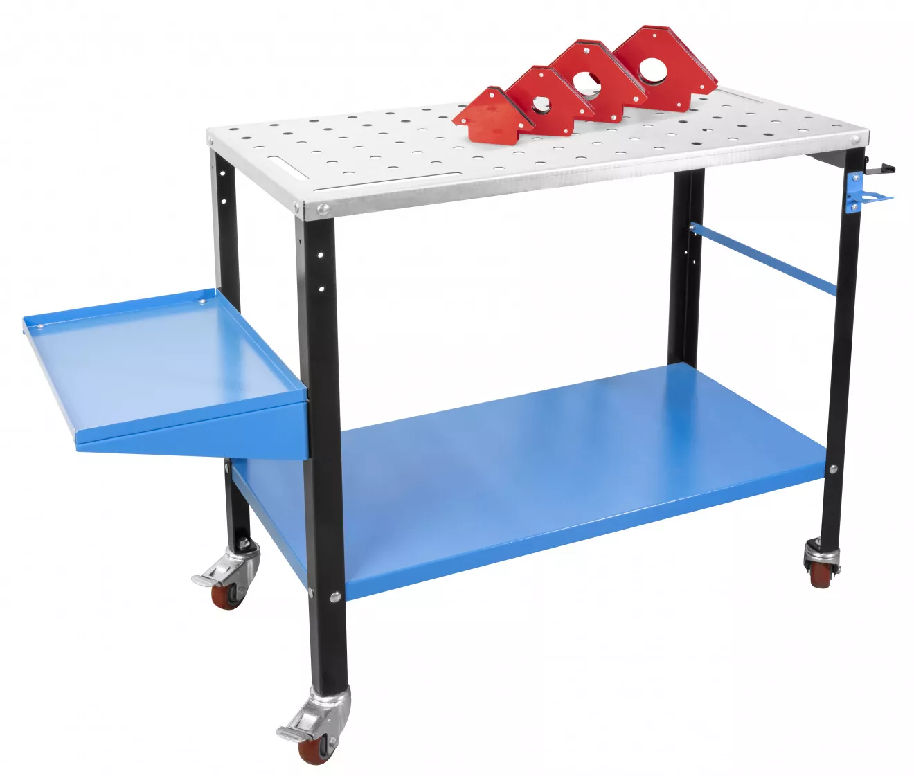 - Pojízdný svařovací stůl, určený pro (ruční) obloukové svařování v údržbářských, řemeslnických i servisních dílnách.Deska stolu s otvory k zajištění svařence pomocí přípravků • konzola na svařovací zdroj • odkládací police (2)