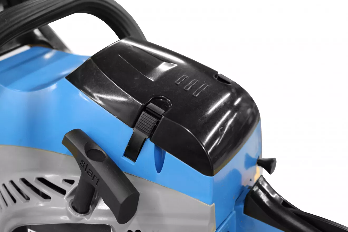 - Konstrukce: plášť pily z tvrzeného plastu, ergonomicky tvarovaná rukojeť (přední držadlo s protiskluzovým povrchem), ocelová zubová opěrka, zachycovač řetězu