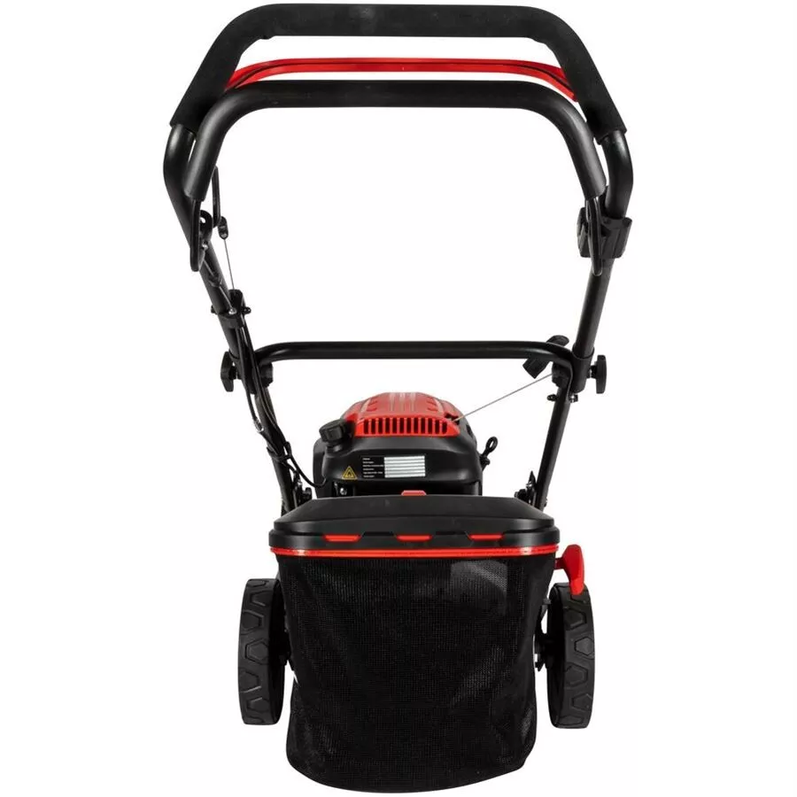 - Benzinová rotační sekačka, určená k sekání středně velkých trávníkových ploch (1.400 m2).Funkce „4IN1“ - sečení, sběr trávy, mulčování, boční výhoz • centrální nastavení výšky sekání (7stupňové, rozsah: 30 - 75 mm) • automatický pojezd (pohon zadních kol, 1rychlostní: 3,6 km/hod).Jednoválcový 4taktní OHV motor POWER-ENGINE S 434 V 2,2 kW (splňující limity škodlivin ve výfukových plynech, stanovené emisní normou EURO V), reverzní startovací systém, PRIMER (manuální palivové čerpadlo), 1 l palivová nádrž. Konstrukce: šasi sekačky z ocelového plechu, výškově nastavitelná řídicí rukojeť, 60 l sběrací koš, rychlospojka pro připojení hadice na vodu, pojezdová kola s kuličkovými ložisky (průměr: přední 180 mm, zadní 230 mm).Celkové rozměry (d x š x v): 1.500 x 525 x 990 mm, spotřeba při plném výkonu: 0,7 l/hod, hladina akustického výkonu LWA: 96 dB (A).