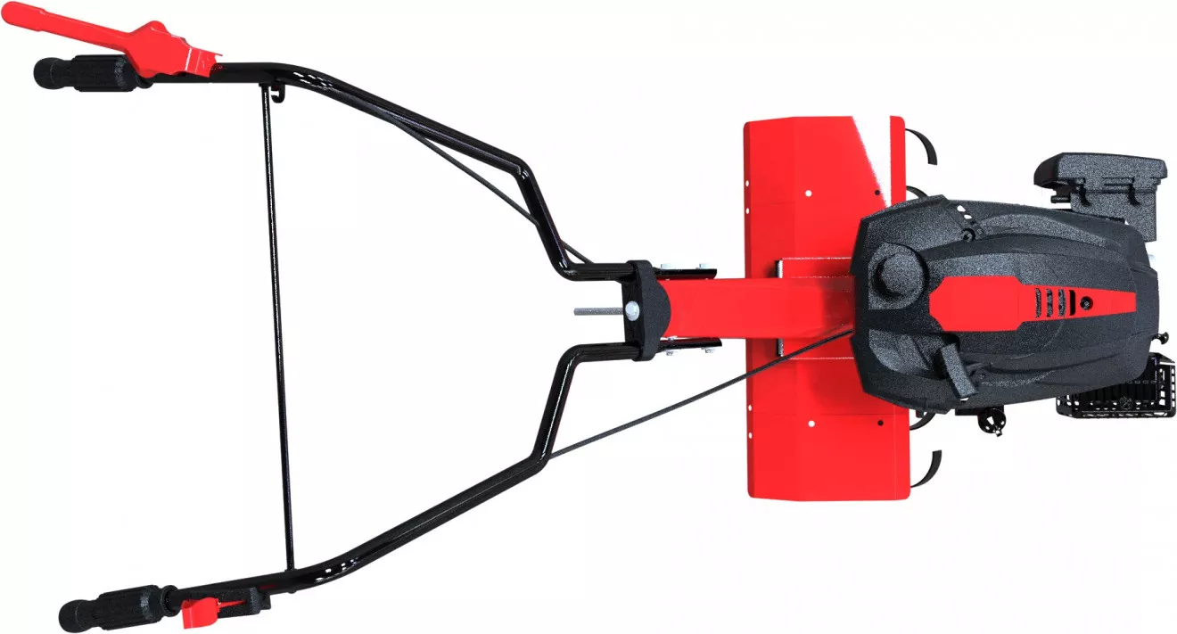 - Konstrukce: široká (ergonomická) řidítka s ovládacími pákami, bezpečnostní vypínač motoru, vrchní kryty nožů, opěrná (smýkací) tyč, sklopné transportní kolo.