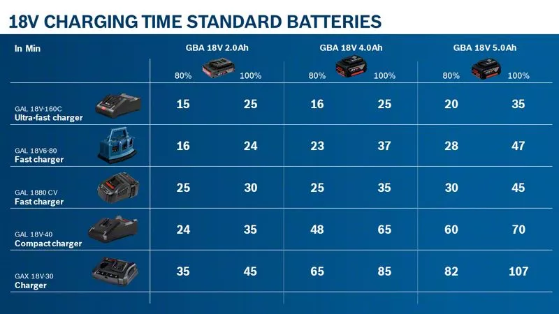 - Díky nabíjecímu proudu 8A se akumulátory ProCORE18V 8,0Ah nabijí až na 80% za pouhých 42 minut.