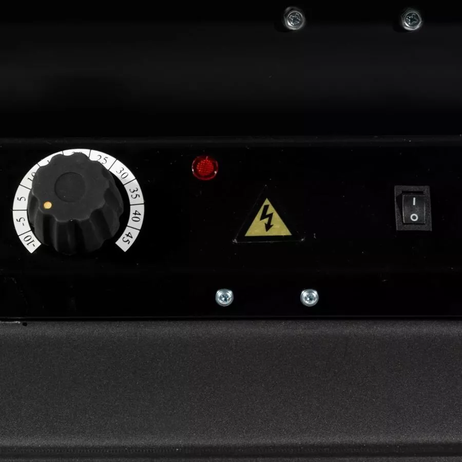 - Prostorový termostat (-> rozsah: -10/+45 °C, automatické zapínání/vypínání hořáku po dosažení nastavené teploty), ventilátor (-> průtok vzduchu: 650 m3/hod.), elektronické zapalování, automatická kontrola plamene (-> fotobuňka), tepelná ochrana