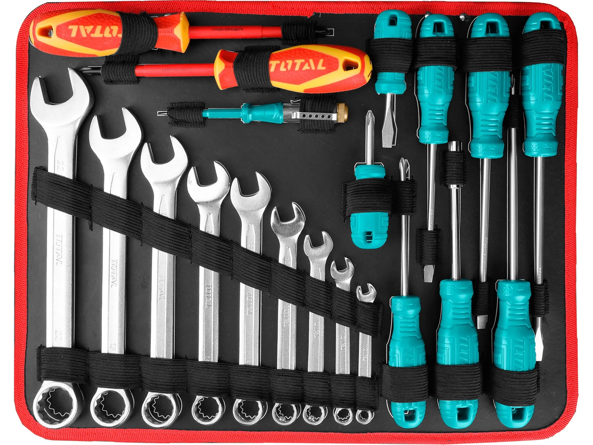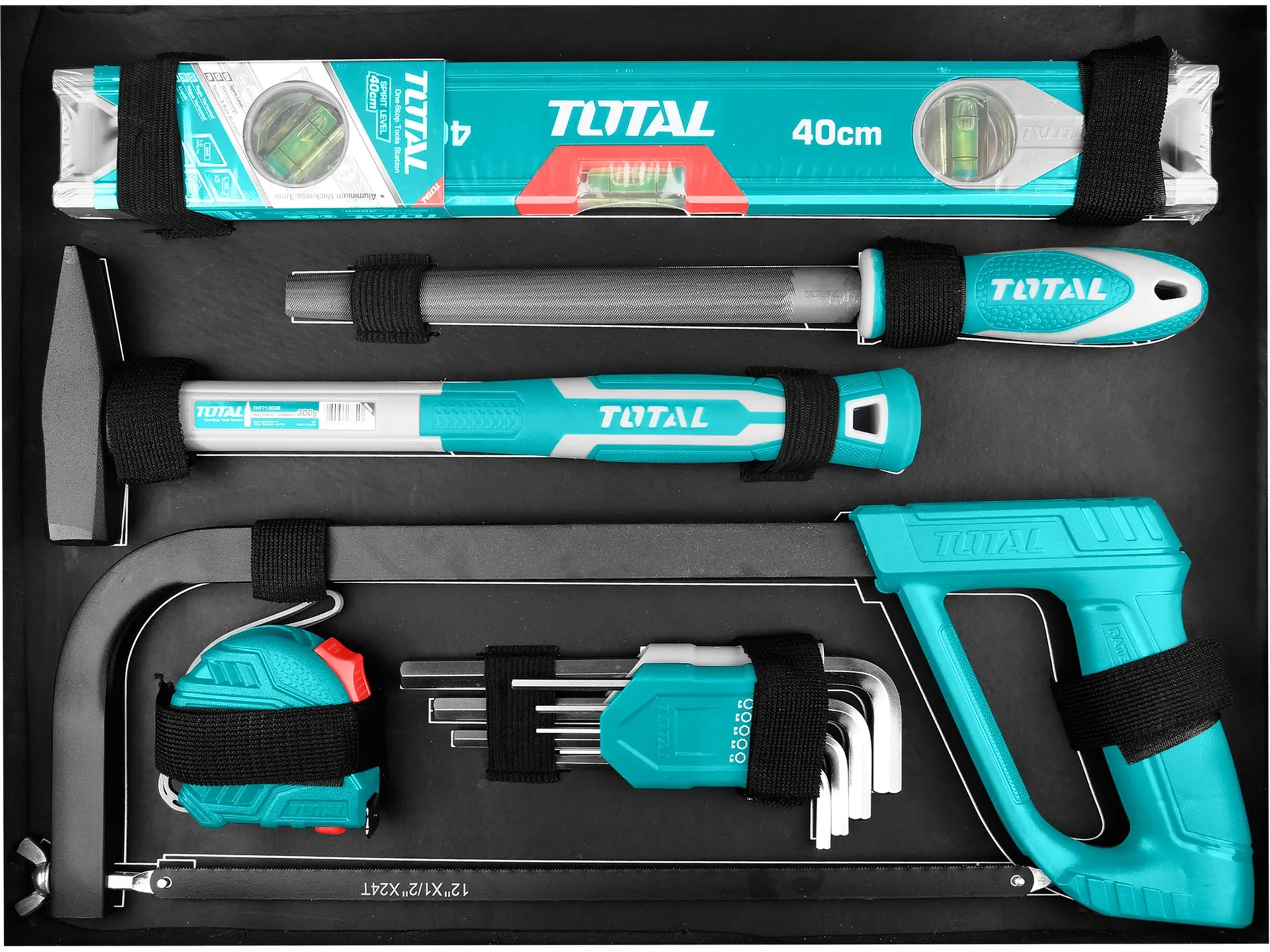 - Bohatá sada obsahující nejrůznější ruční nářadí od kleští, přes gola sadu až po vodováhu. Vše uloženo v praktickém kufru s kolečky a výsuvnou rukojetí.