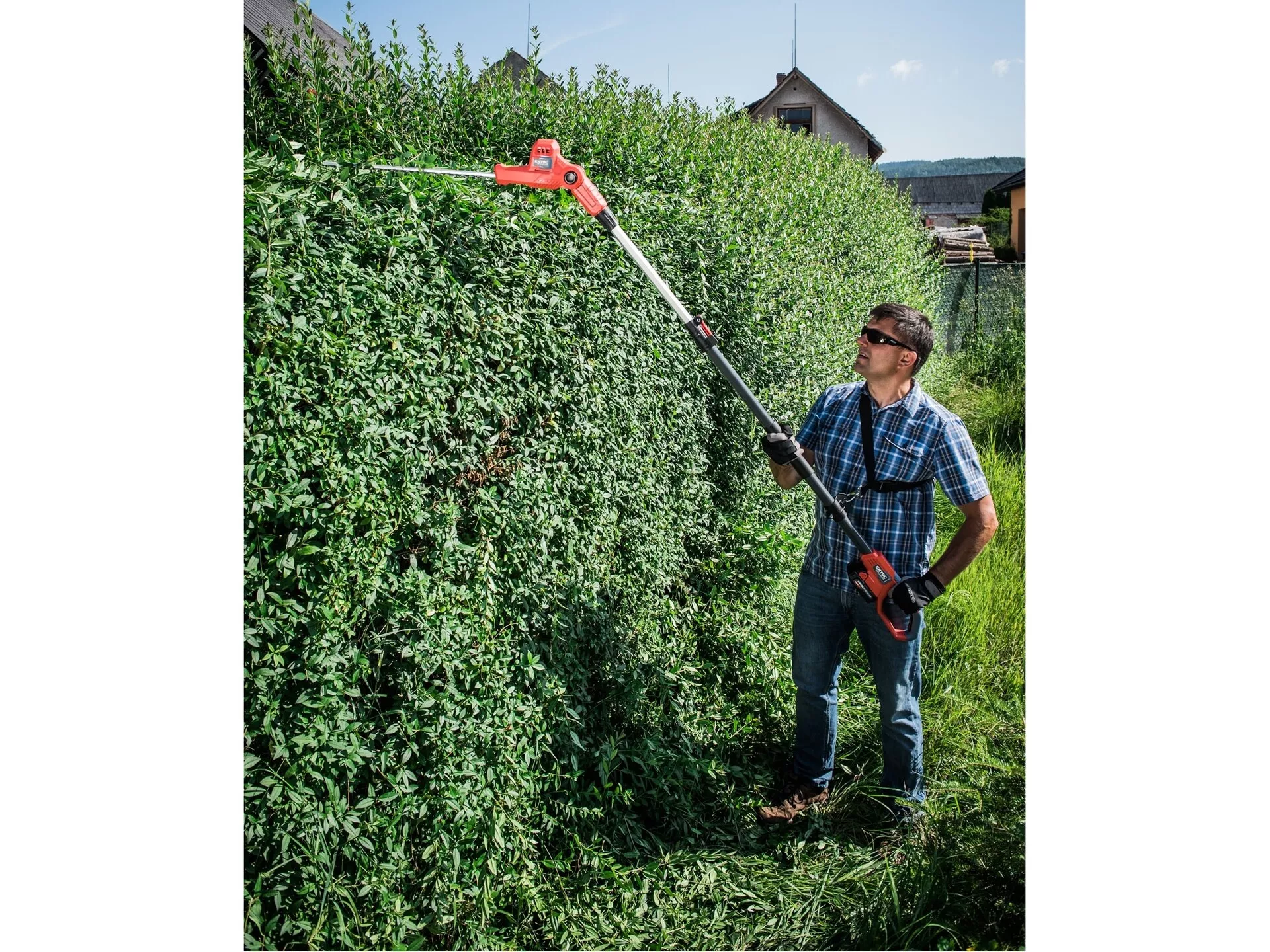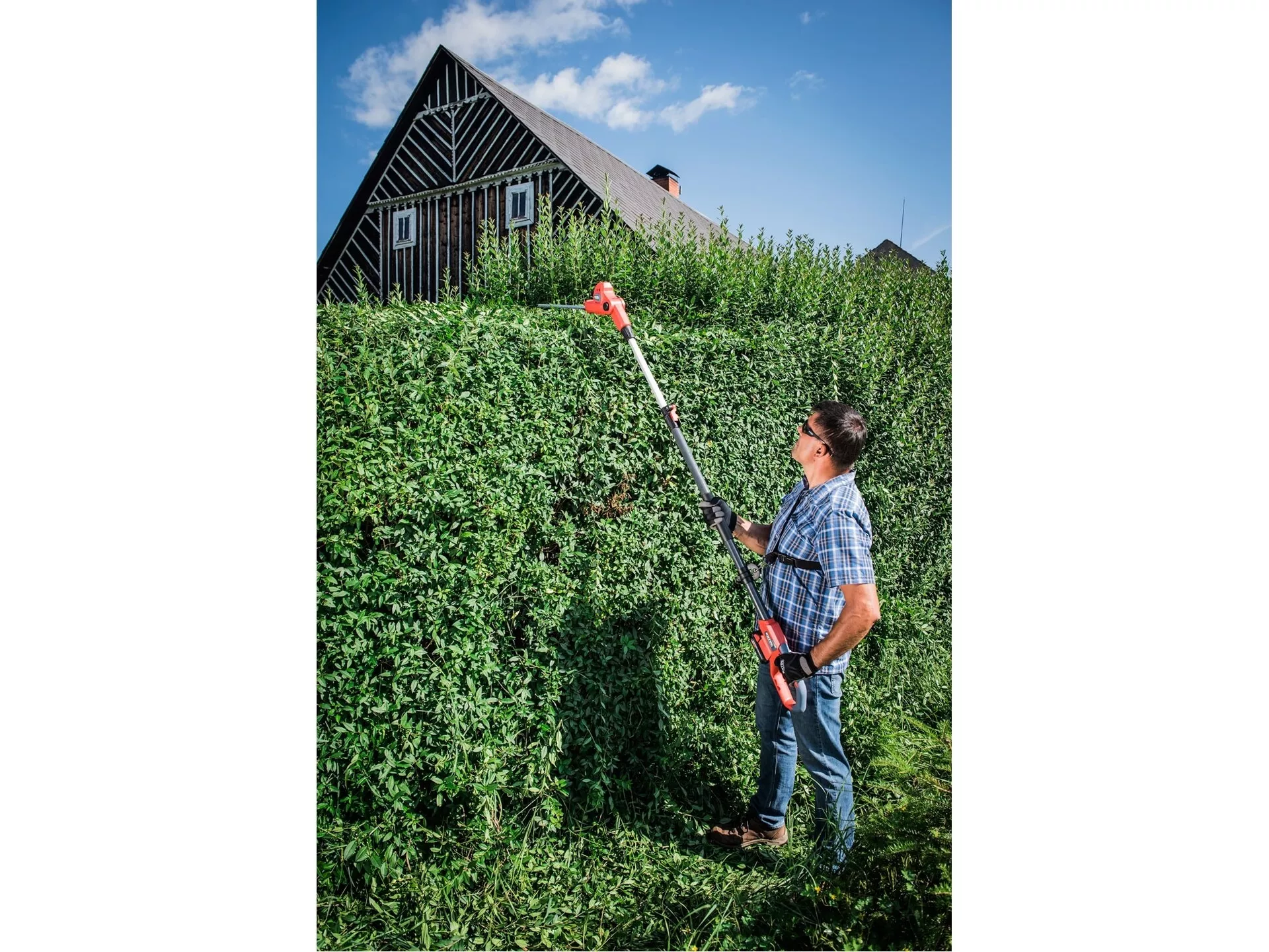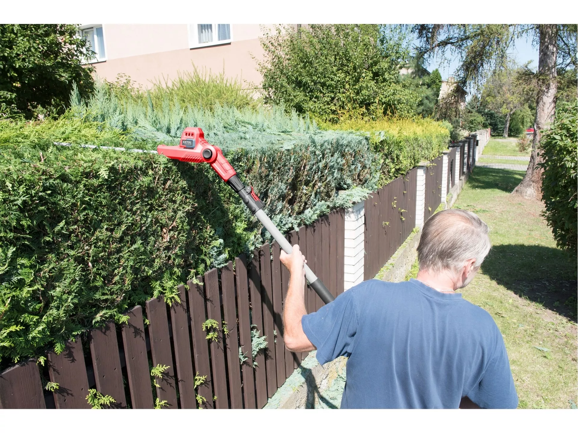- Teleskopické aku nůžky jsou určeny ke stříhání živého plotu ve výškách až 3m v domácích zahradách. Dobré vyvážení, nízká hmotnost a ramenní popruh usnadňují manipulaci při práci. Horní část nůžek je vybavena kloubem, který umožňuje upravit sklon čepele dle typu práce. Maximální průměr střihaných větví je 15mm. Pogumovaná rukojeť brání vysmeknutí, tlumí vibrace a zpříjemňuje držení při práci. Ostrá stříhací čepel si snadno poradí s živým plotem a je osazena hliníkovou lištou, která ji chrání před poškozením. Stroj je vybaven bezpečnostní pojistkou, která se aktivuje při vyklouznutí z rukou a elektronickou doběhovou brzdou, která zajistí jeho rychlé zastavení. Díky napájení z baterie již není nutné dávat pozor na napájecí kabel a manipulace s nimi je pohodlnější. Akumulátor je vybaven ukazatelem nabití, což umožňuje uživateli si rozvrhnout délku práce a dát si včas nabít další akumulátor. Díky použité Li-ion technologii je ho možné kdykoliv dobíjet, aniž by se tím snižovala jeho kapacita. Li-ion akumulátor ztrácí energii vlivem samovybíjení velmi pomalu a vydrží dlouho nabitý a připravený k použití.