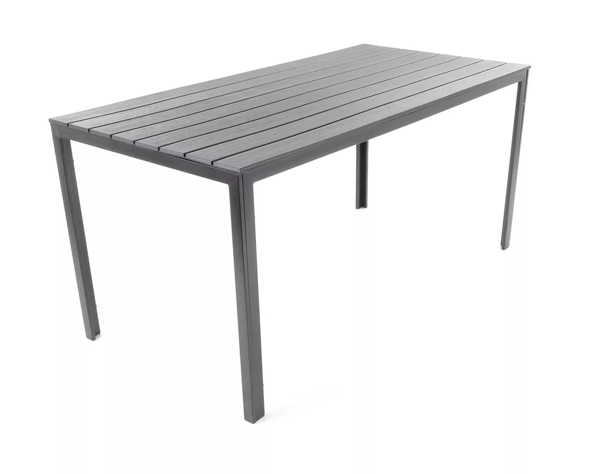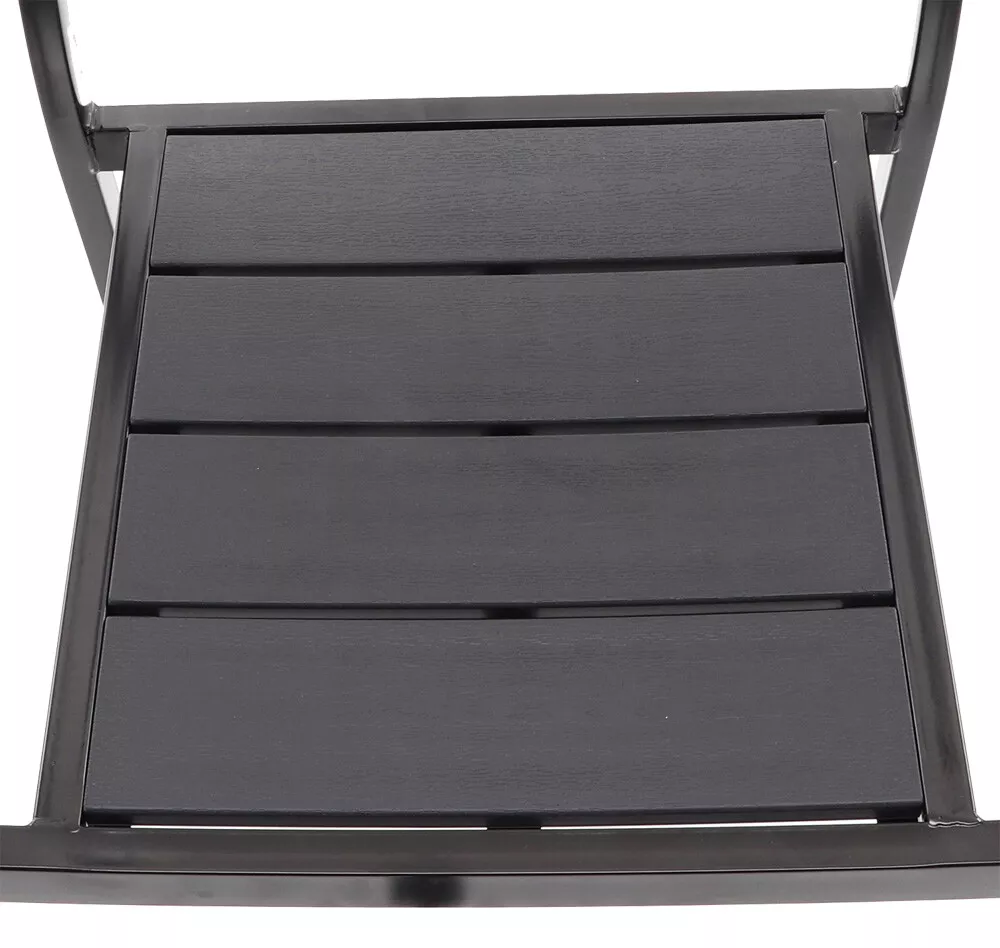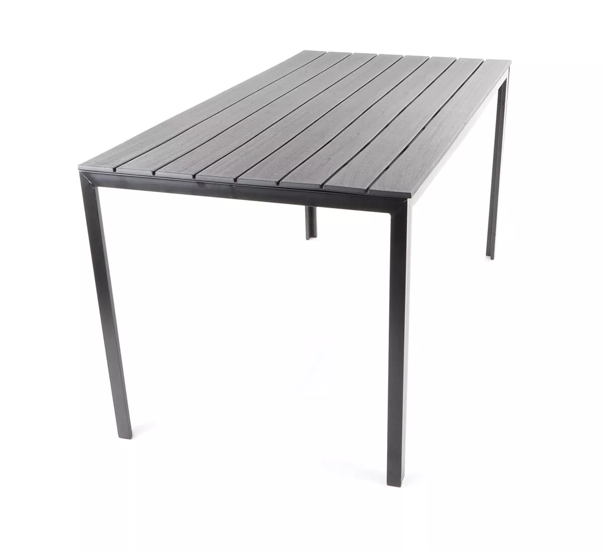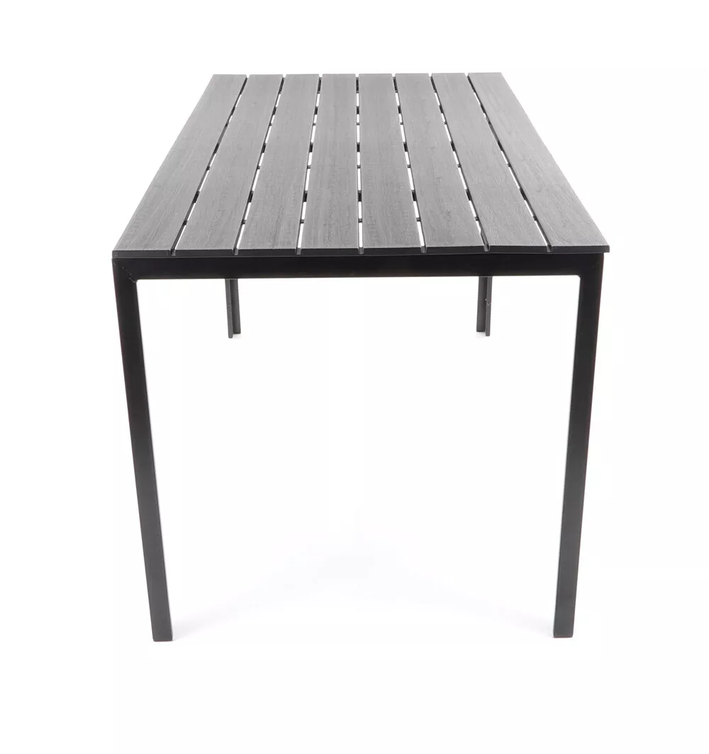 - Stůl je zhotoven z ocelových profilů povrchově dokončen komaxitovou barvou . Deska stolu je v imitaci masivního dřeva z lisovaného plastu s UV filtrem .