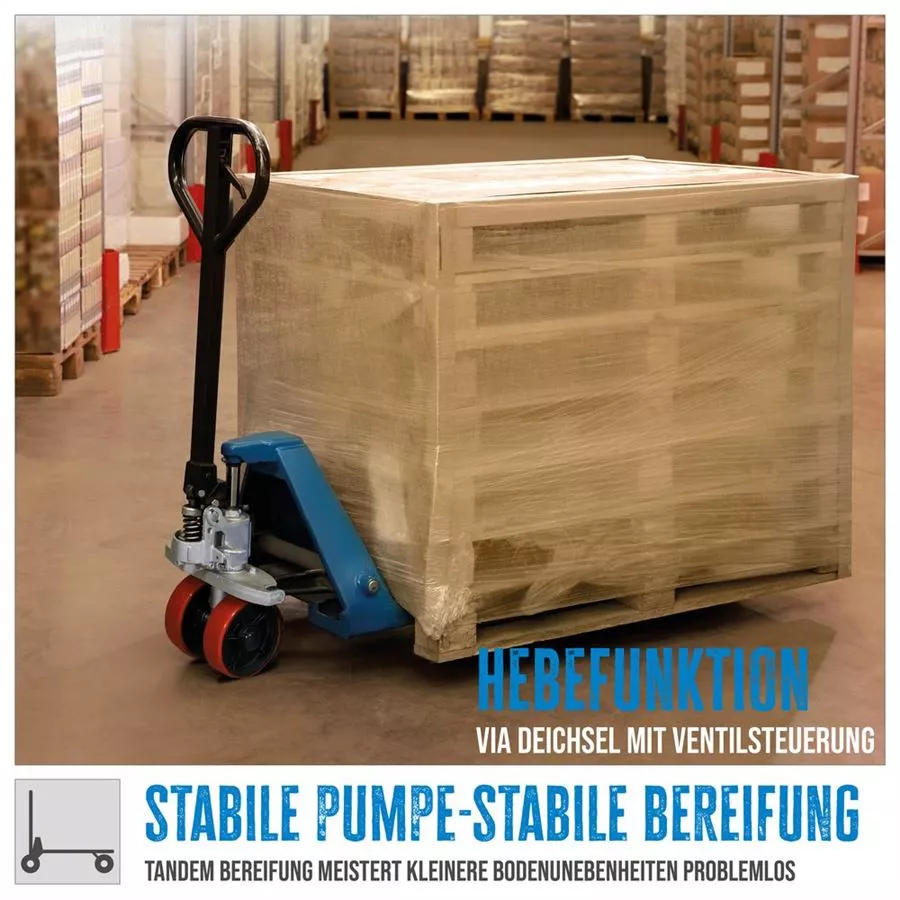 - Jednoduché (rychlé) přepínání mezi funkcemi zdvih-přeprava-spouštění pomocí ovládací páčky • okamžité spuštění vidlice také sešlápnutím nožního pedálu • nájezdové válečky, umožňující snadné nabírání palet z boku. Konstrukce: svařovaný ocelový rám, hydraulický válec, kloubové uložení vodicích kol, sloupek řízení s rejdem (až) 180°, ergonomická rukojeť