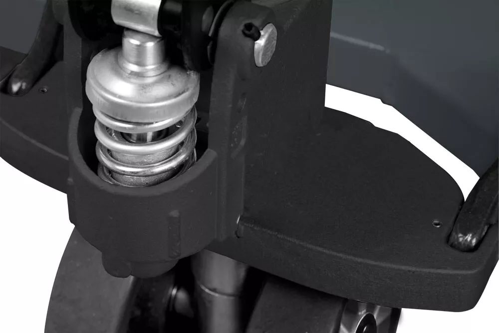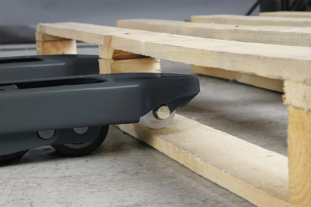 - Snadný pojezd i při velkém zatížení díky mimořádně tichým řízeným kolečkům s plně pogumovaným povrchem a dvojitým vidlicovými kolečky