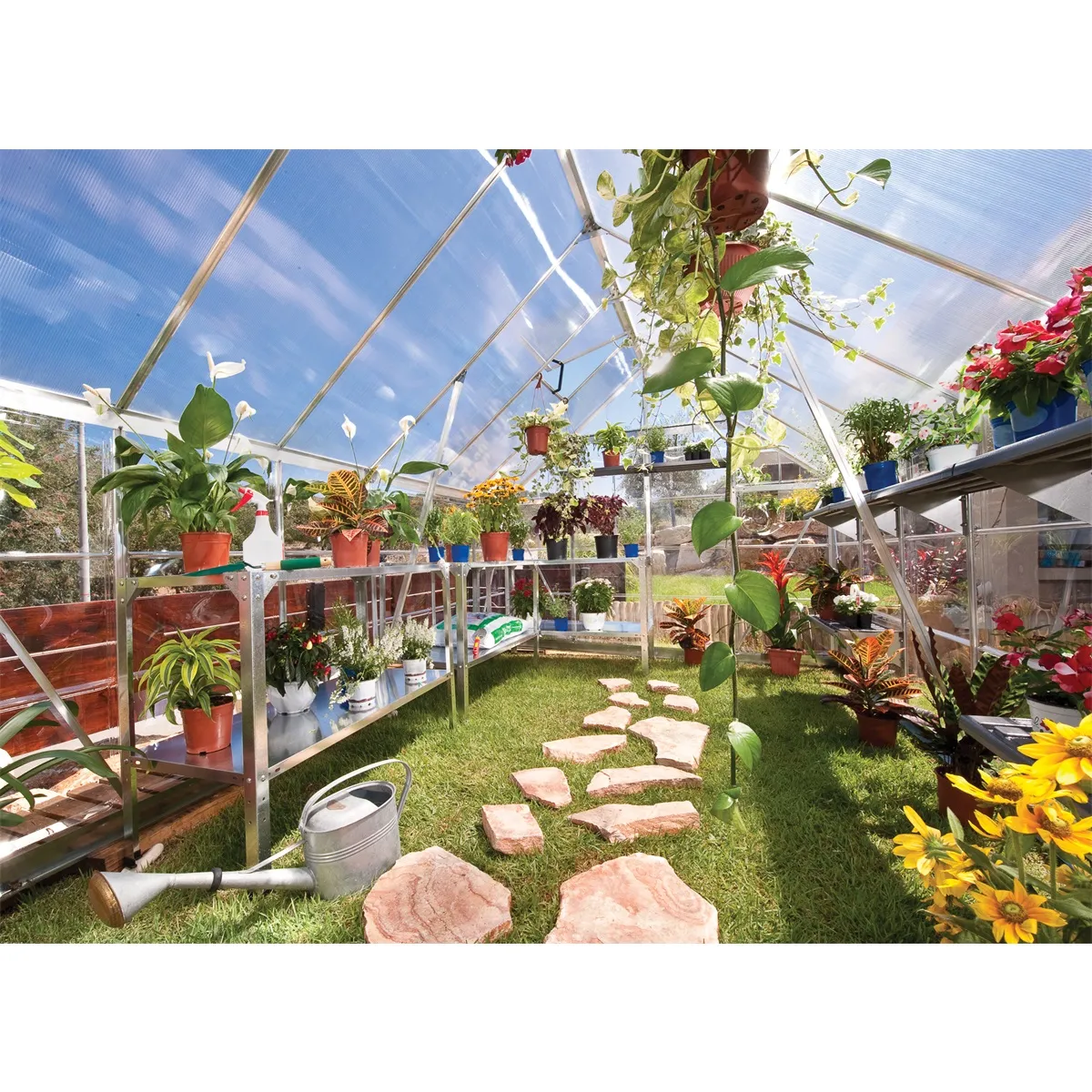 - • Prakticky nerozbitné stěny z čirého a střecha ze špičkového dvojitého polykarbonátu Palram udržují ve skleníku optimální teplotu a chrání rostliny před přímým slunečním zářením.