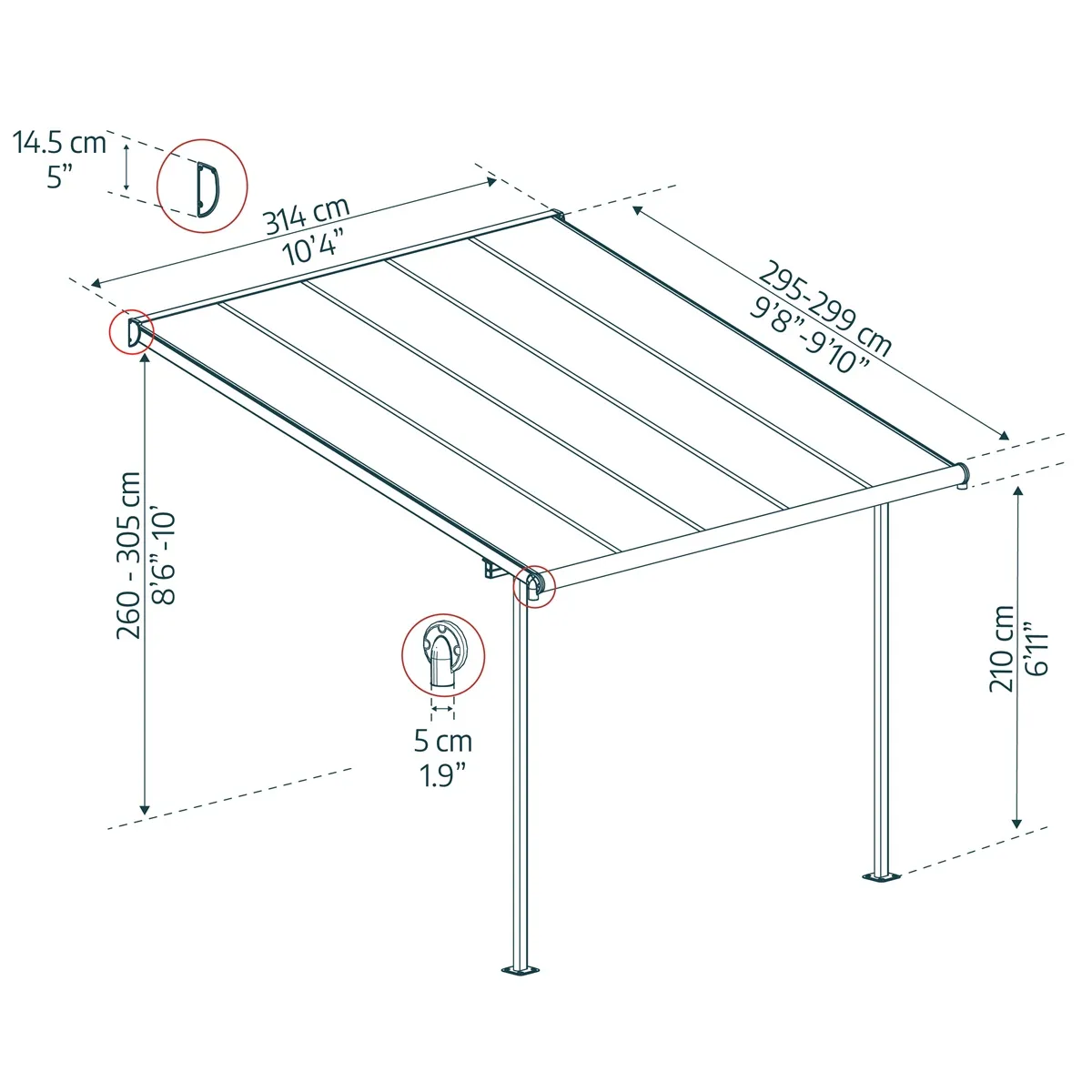 - Rozměry přístřešku (D x Š x V): 314 x 226-286 x 260-305 cm