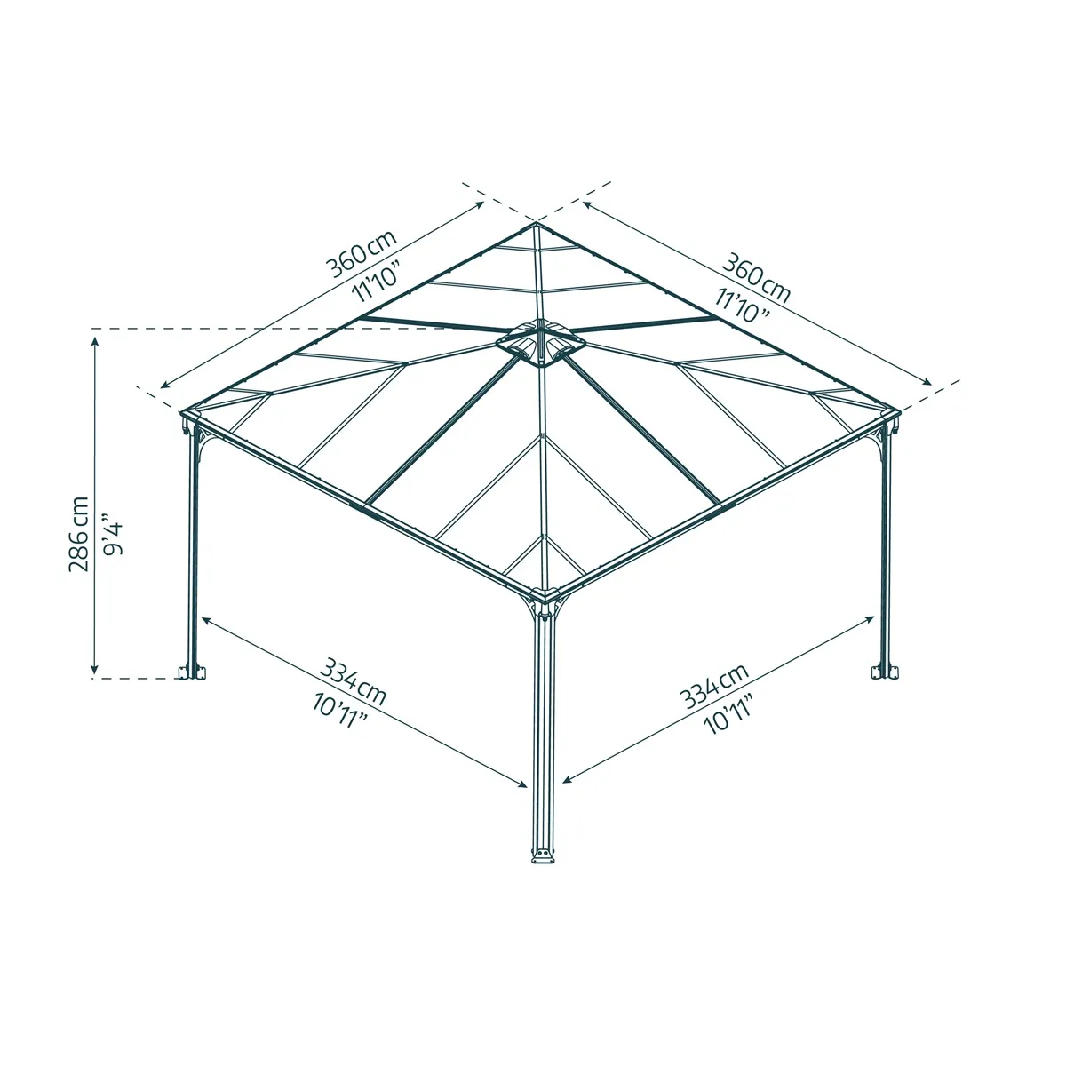 - Rozměry altánu (D x Š x V): 360 x 360 x 290 cm