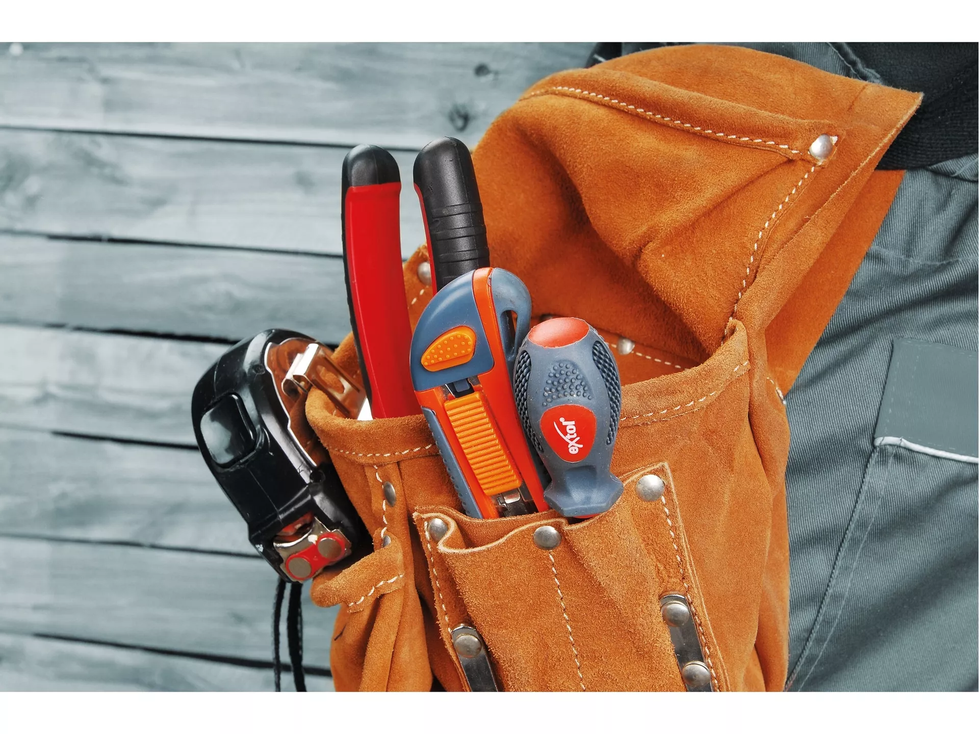 - Vyroben z kvalitní kůže. Nastavitelný pásek. Různé kapsy na materiál a nářadí.