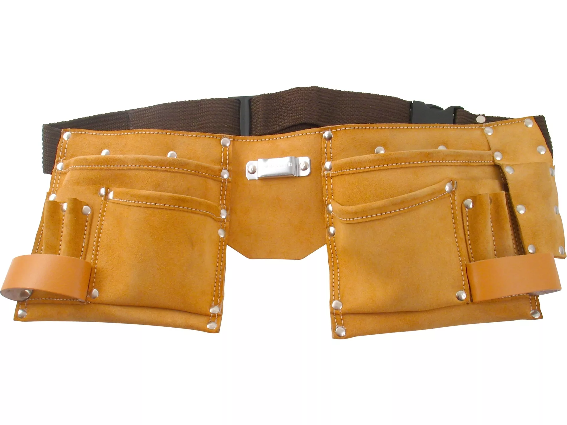- Vyroben z kvalitní kůže. Nastavitelný pásek. Různé kapsy na materiál a nářadí.