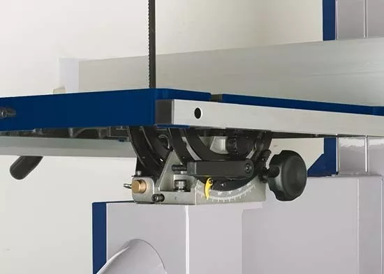 - Velký otočný stůl pily z šedé litiny z jednoho kusu, otočný v rozsahu -10° až +45°, s přesně zabroušeným a vyleštěným povrchem