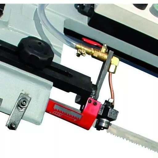 - Konstrukce: litinový rám pily, 3-bodové vedení pilového pásu, čerpadlo chladiva, ocelový svěrák pro upnutí řezaného materiálu, podstavec s transportními koly (4).Příslušenství: bimetalový pilový pás, kartáč na kovové piliny