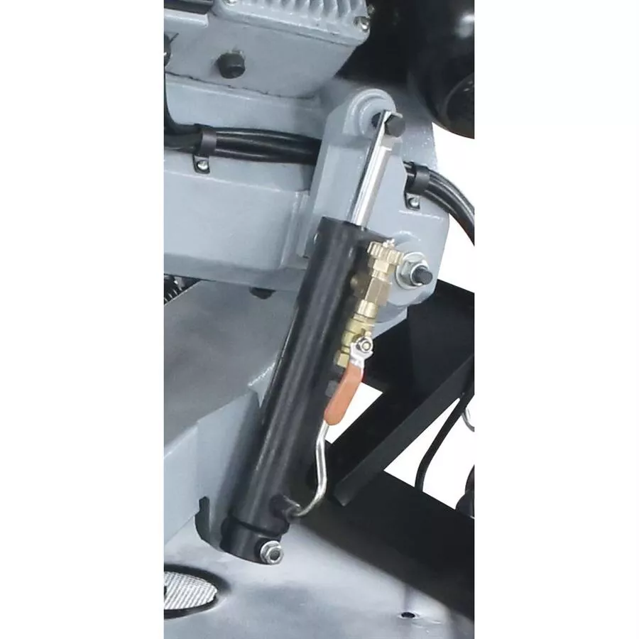 - 4 rychlostní stupně posuvu pilového pásu (→ manuální nastavení pomocí řemenic, řezné rychlosti: 24/41/61/82 m/min.-1 dle typu materiálu), otočné/výklopné pilové rameno (→ rozsah otáčení: ± 45°, funkce vertikálního řezání), přesné nastavení přítlačné síly ramene pily (→ hydraulické ovládání), otočný rychloupínací svěrák pro řezy pod úhlem 90 - 45°, funkce automatického koncového vypínání