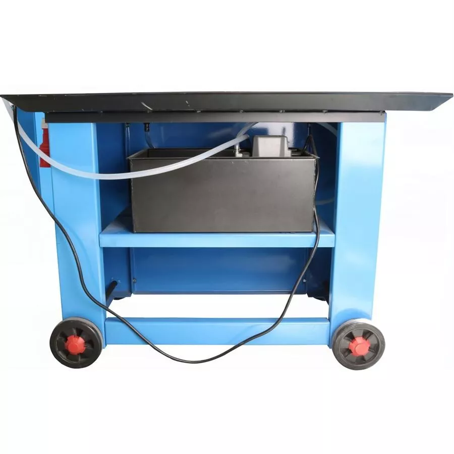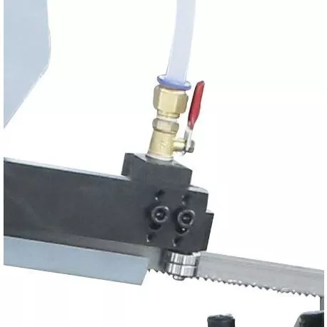 - Konstrukce: litinový rám pily, 10 vodicích ložisek pilového pásu, čerpadlo chladiva, ocelový svěrák pro upnutí řezaného materiálu, podstavec s transportními koly (4).Příslušenství: bimetalový pilový pás, kartáč na kovové piliny