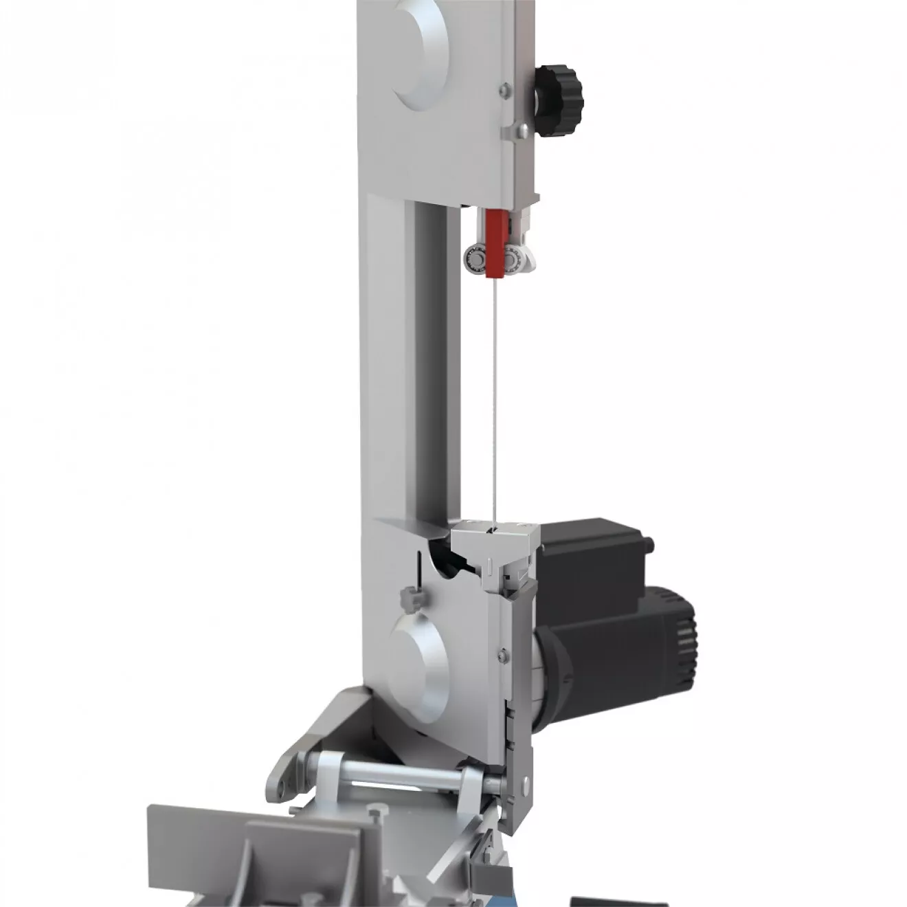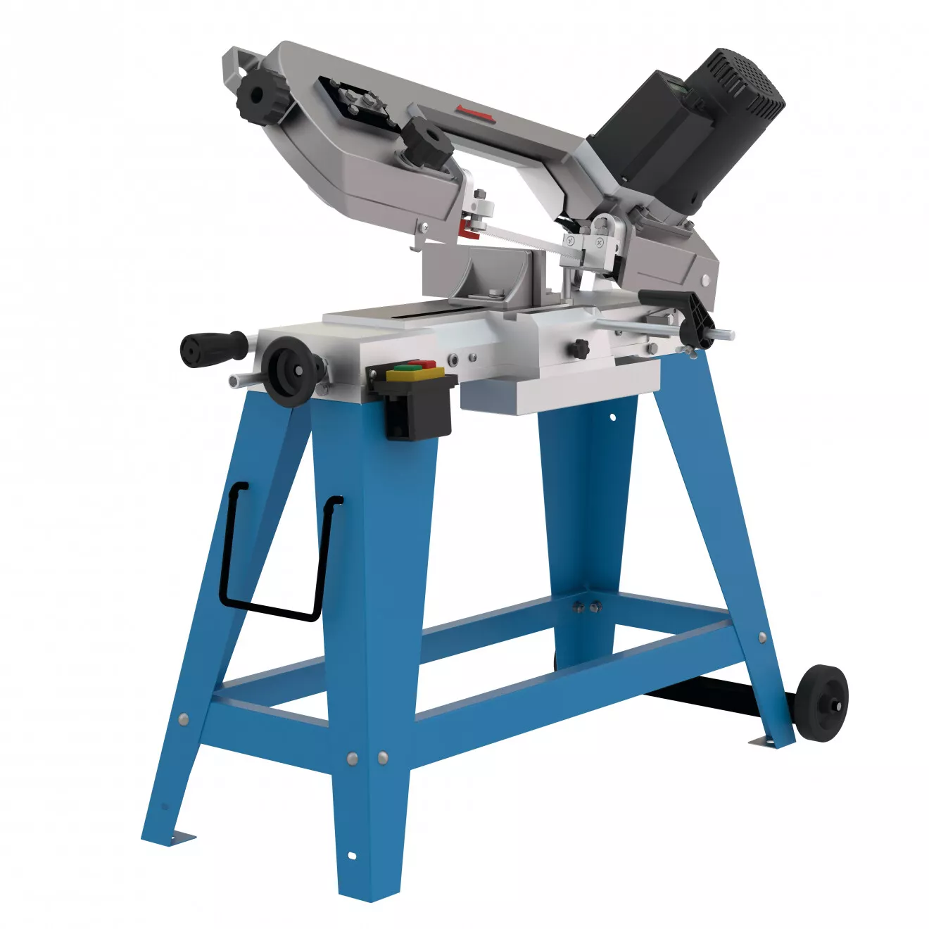 - Konstrukce: robustní litinový rám, 3bodové vedení pilového pásu (kuličková ložiska), stabilní podstavec s transportními koly (2), manipulační rukojeť