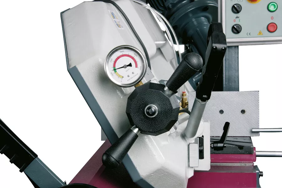 - Cenově výhodná pásová pila na kov s optimálním řezným výkonem je díky snadné obsluze, hydraulickému a chladicímu zařízení vhodná i pro náročnější kutily, kteří nepotřebují oboustranné úhlování ramena. Rychlost plynulého klesání ramene pily lze korigovat za pomocí ventilu na hydraulickém válci, který lze i snadno odstranit. Řeznou rychlost pilového pásu lze manuálně nastavit na požadovanou polohu klínového řemene na řemenici, která pak následně přenáší pohyb přes šnekovou převodovku v olejové lázni na pásovici s pilovým pásem. Chladící systém je zabudovaný ve stabilním mobilním podstavci. Volba rychlosti padání ramene, k tomu optimální řezná rychlost a chlazeníkapalinou v místě řezu, prodlužují životnost pilového pásu až na trojnásobek. Koncový vypínač zastavuje pilový pás po ukončení řezu u tohoto modelu automaticky. Řez pod úhlem 0-45° se provádí nastavením pevné čelisti svěrákudle stupnice umístěné na základně. Součásti dodávky pásové pily na kov PPK-115HC/230:• Pilový pás
