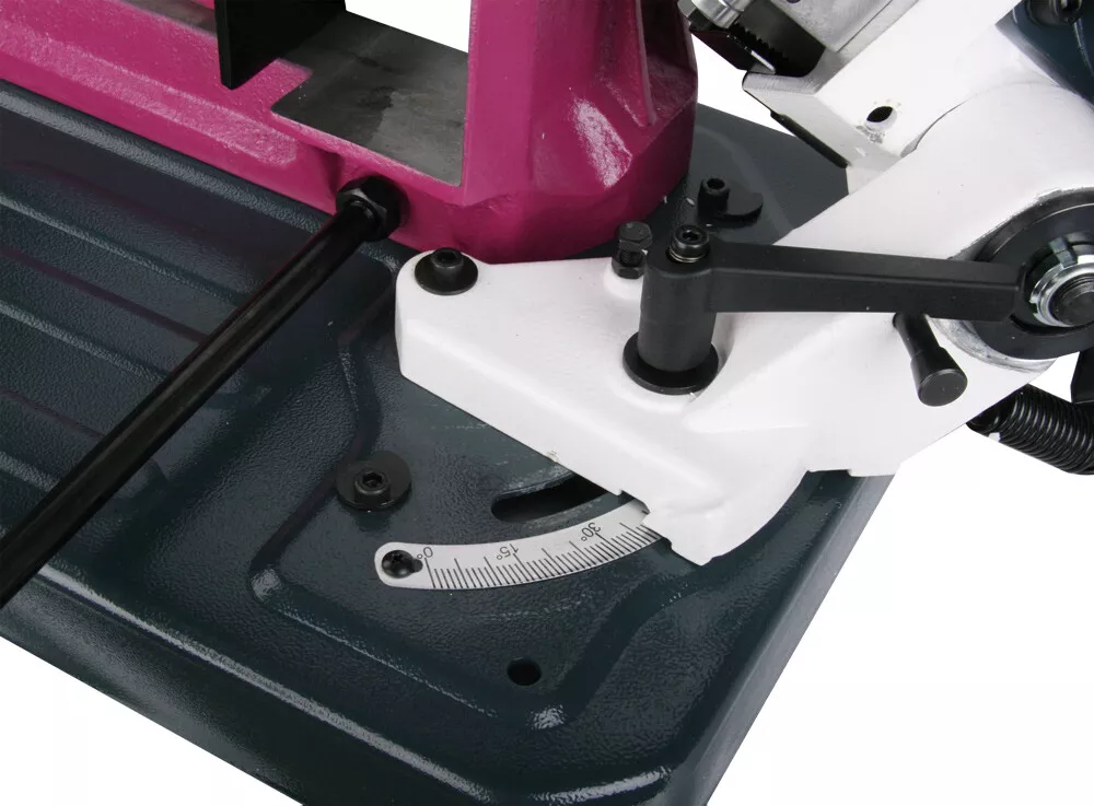 - Cenově výhodná pásová pila na kov s optimálním řezným výkonem je díky snadné obsluze, hydraulickému a chladicímu zařízení vhodná i pro náročnější kutily, kteří nepotřebují oboustranné úhlování ramena. Rychlost plynulého klesání ramene pily lze korigovat za pomocí ventilu na hydraulickém válci, který lze i snadno odstranit. Řeznou rychlost pilového pásu lze manuálně nastavit na požadovanou polohu klínového řemene na řemenici, která pak následně přenáší pohyb přes šnekovou převodovku v olejové lázni na pásovici s pilovým pásem. Chladící systém je zabudovaný ve stabilním mobilním podstavci. Volba rychlosti padání ramene, k tomu optimální řezná rychlost a chlazeníkapalinou v místě řezu, prodlužují životnost pilového pásu až na trojnásobek. Koncový vypínač zastavuje pilový pás po ukončení řezu u tohoto modelu automaticky. Řez pod úhlem 0-45° se provádí nastavením pevné čelisti svěrákudle stupnice umístěné na základně. Součásti dodávky pásové pily na kov PPK-115HC/230:• Pilový pás