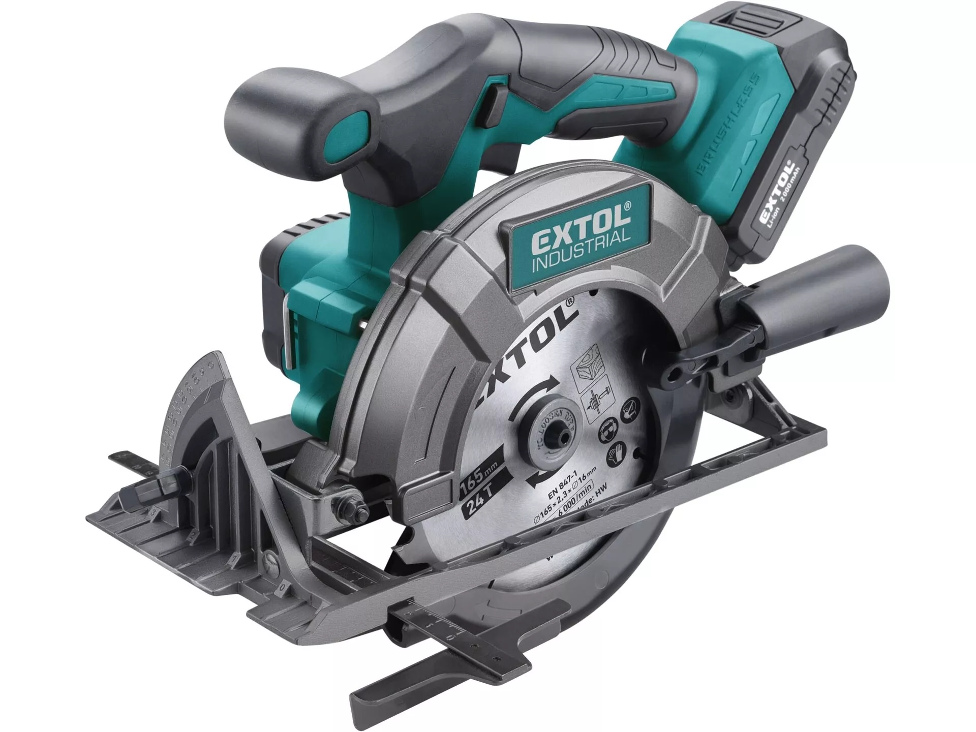 - Brushless kotoučová pila je navržena tak, aby uživatelům poskytla výkonné a snadné řezání při různých instalatérských, elektrických, rámovacích, dokončovacích a tesařských pracích. Pila je poháněná nejmodernějším „brushless" motorem s 3650 ot./min umožňuje uživatelům rychle a snadno řezat tvrdým materiálem. Tento nový typ motoru má vyšší životnost, je výkonnější a má menší spotřebu el. energie než klasické motory s uhlíkovými kartáči. Horní a spodní kovový ochranný kryt poskytují vynikající ochranu kotouče při pádu. Gumová měkká rukojeť je ergonomicky navržena tak, aby uživatelům poskytovala vynikající pohodlí a vyvážení pro snadno ovladatelné řezy. Pro běžnou práci dostačují jeden nebo dva 2000mAh akumulátory, které můžete rychle nabít v rychlonabíječce, pro náročnější nebo delší práci doporučujeme větší akumulátory s kapacitou 4000–8000mAh. Akumulátor lze použít ve všech typech nářadí řady EXTOL SHARE20V. Díky použité Li-ion technologii je ho možné kdykoliv dobíjet, aniž by se tím snižovala jeho kapacita. Li-ion akumulátor ztrácí energii vlivem samovybíjení velmi pomalu a vydrží dlouho nabitý a připravený k použití.