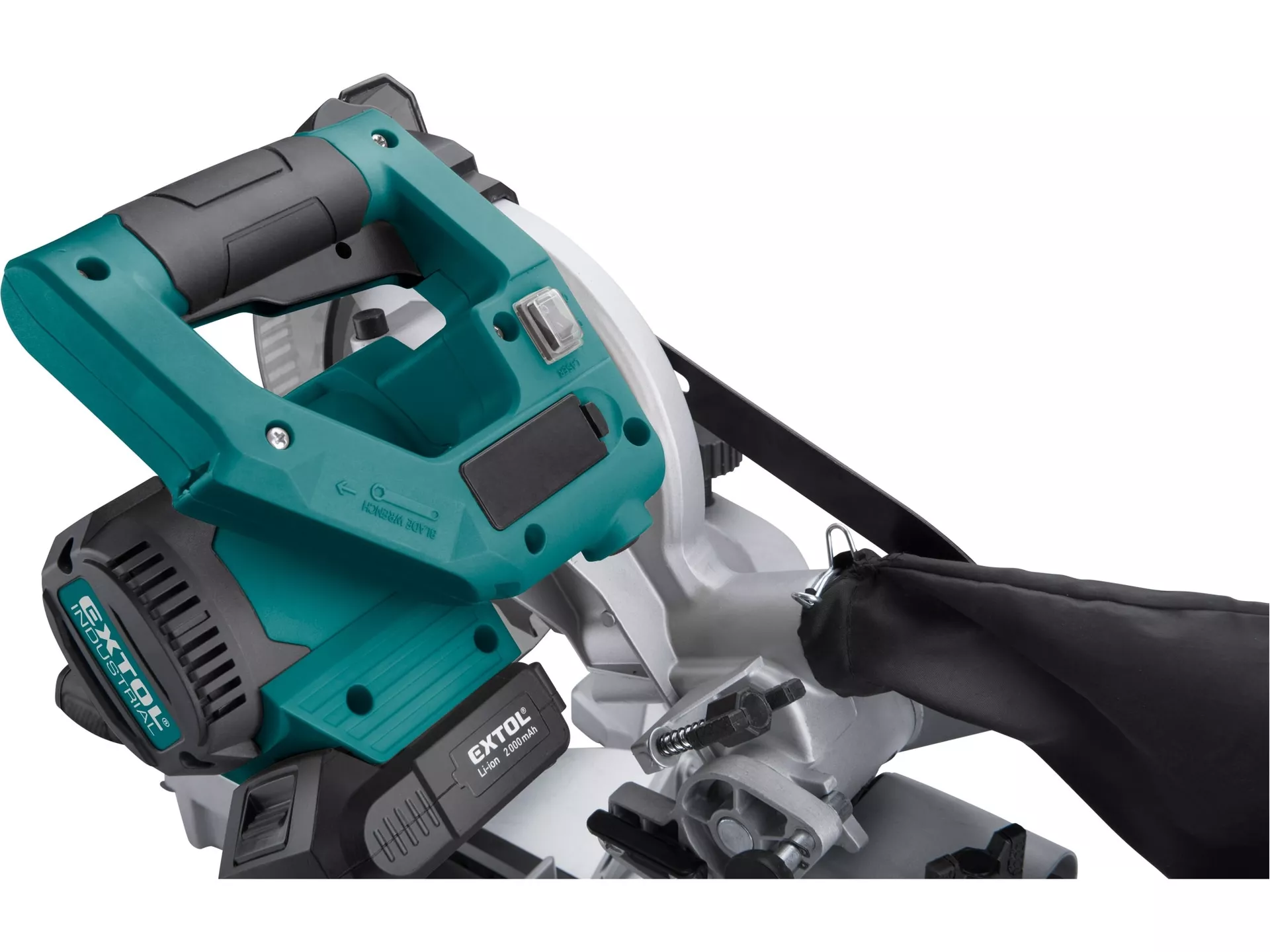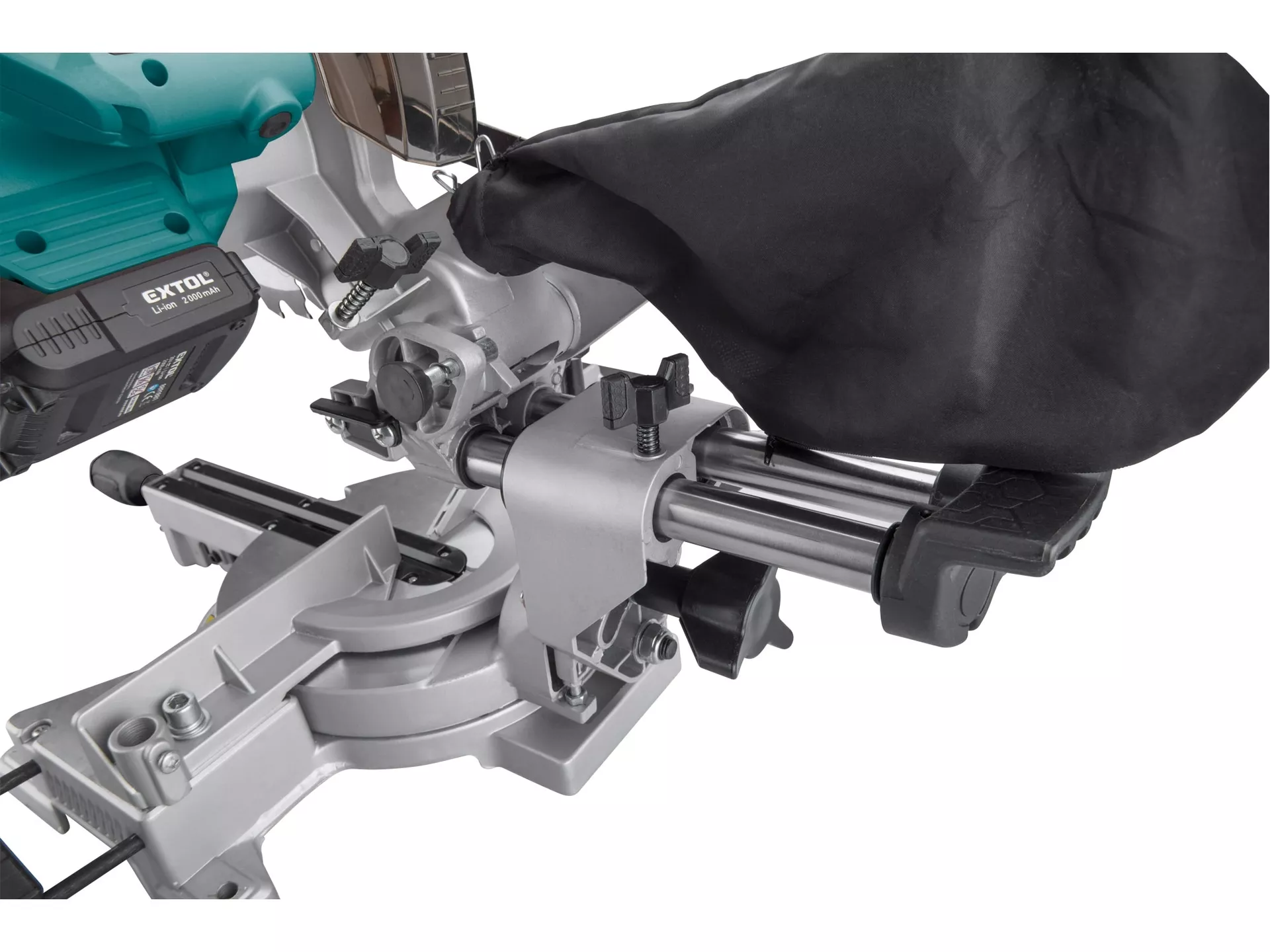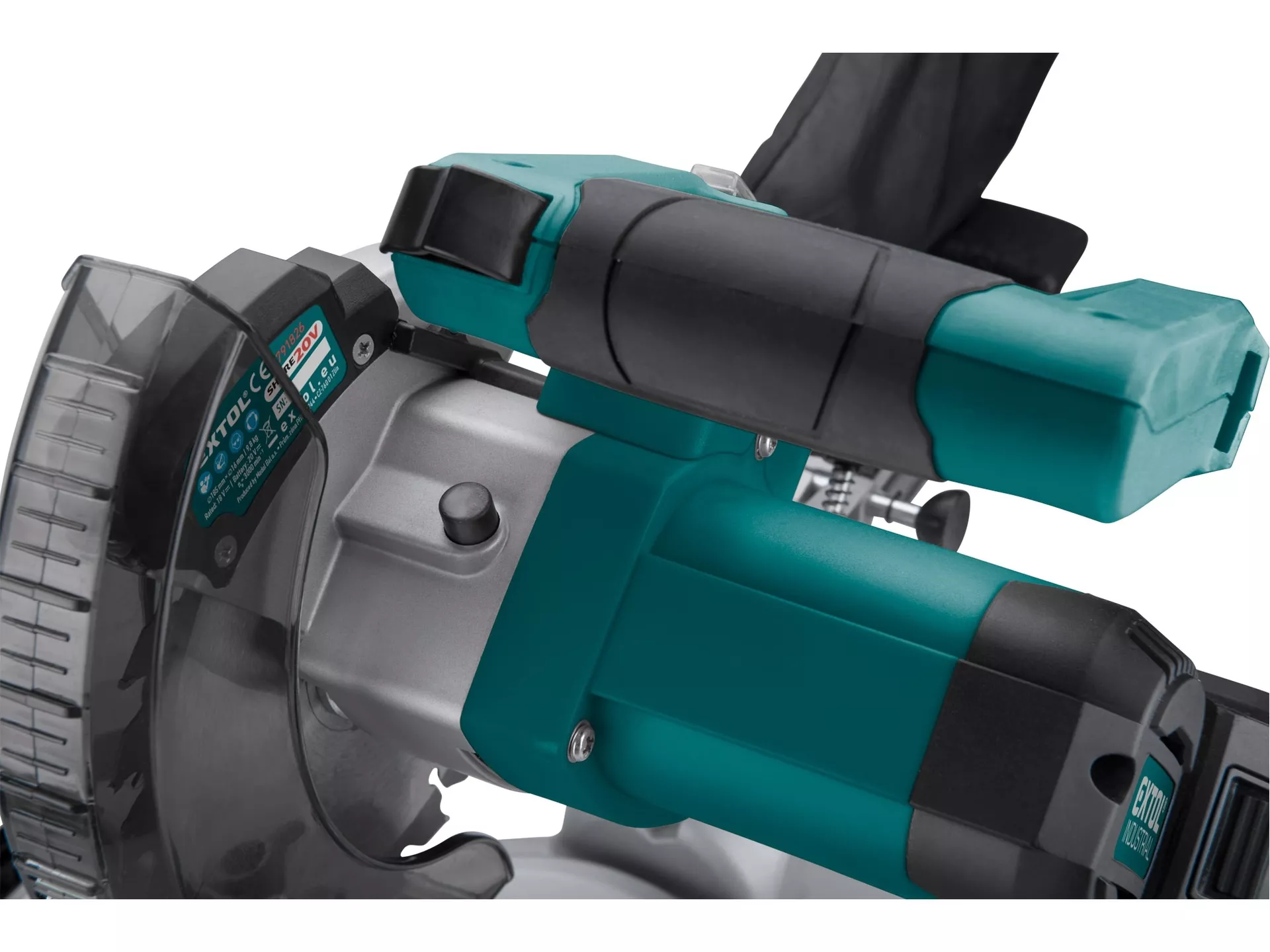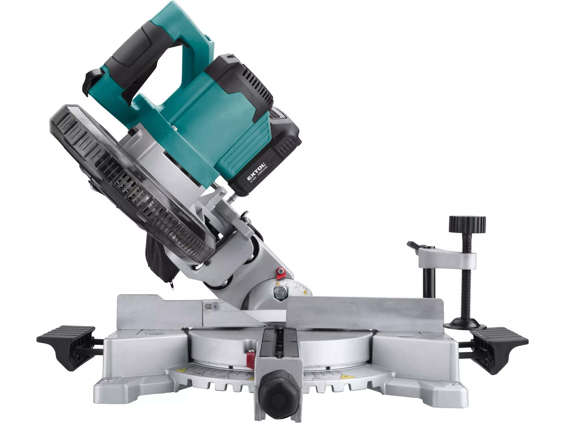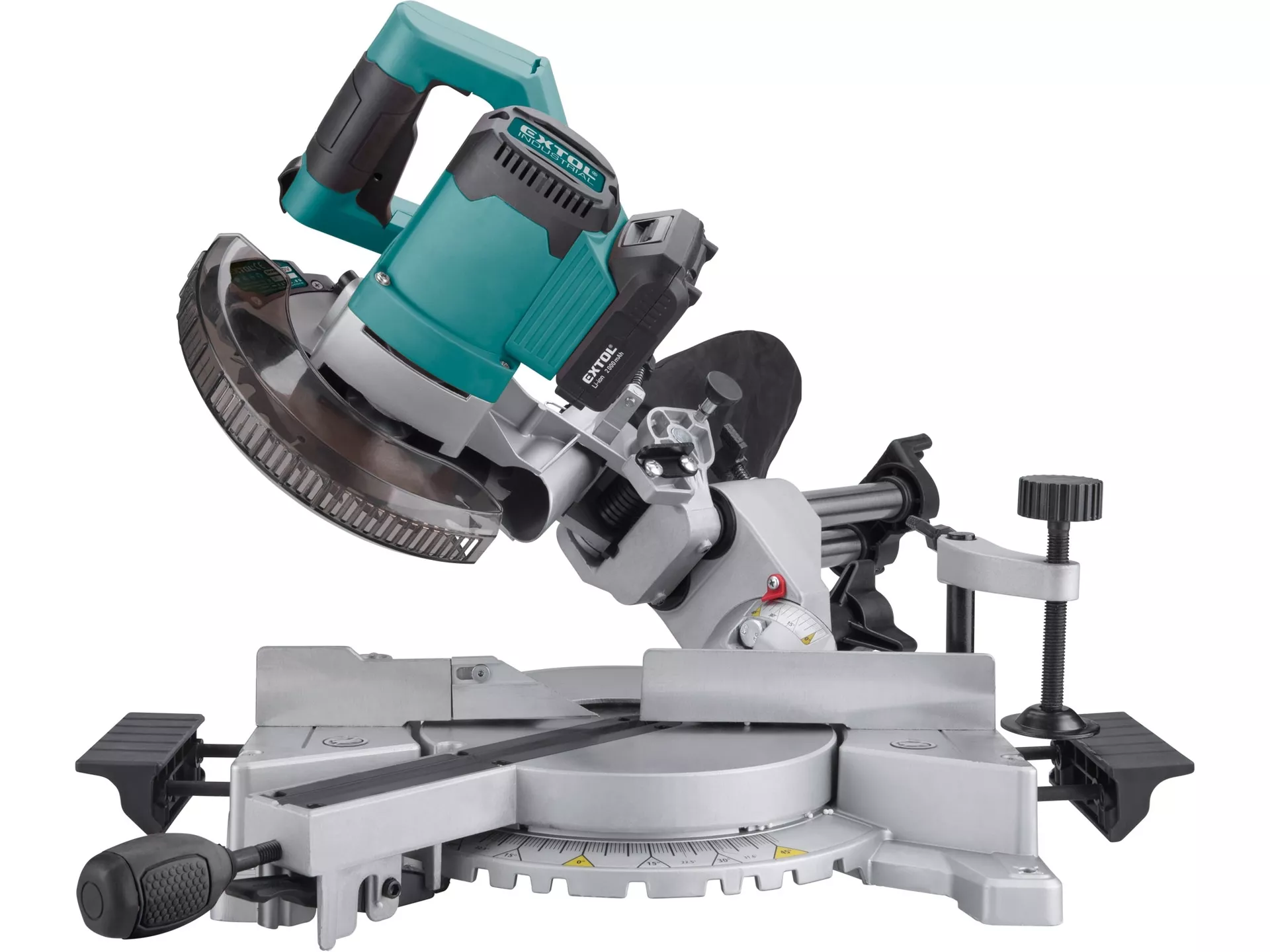 - Aku pokosová a kapovací pila s laserem je určena k provádění přesných příčných a podélných řezů dřeva používaného pro stavební účely, dřevovláknitých a dřevotřískových desek, dále tenké umělé hmoty, hliníkových profilů a tenkých měkkých neželezných materiálů s použitím k tomu určených pilových kotoučů. Pila je poháněná nejmodernějším „brushless" motorem s 3300 ot./min, který umožňuje uživatelům rychle a snadno řezat materiálem. Tento nový typ motoru má vyšší životnost, je výkonnější a má menší spotřebu el. energie než klasické motory s uhlíkovými kartáči. Masivní základna pily je vyrobena z hliníku. Pro pohodlnou práci je pila vybavena laserem, výsuvnými opěrkami pro delší materiály a svěrkou pomocí které si můžete upnout materiál na pracovní plochu. Pro zvýšení bezpečnosti práce má pila el. brzdu, která zastaví pilový kotouč ihned po vypnutí. Součástí pily je výstup pro zachytávání pilin do přiloženého pytlíku nebo pro připojení k odsávacímu systému. 2000mAh baterie stačí až na 110 řezů hranolu 50×50mm. Pro běžnou práci dostačují jeden nebo dva 2000mAh akumulátory, které můžete rychle nabít v rychlonabíječce, pro náročnější nebo delší práci doporučujeme větší akumulátory s kapacitou 4000–8000mAh, které také poskytují vyšší řezací výkon. Akumulátor lze použít ve všech typech nářadí řady EXTOL SHARE20V. Díky použité Li-ion technologii je ho možné kdykoliv dobíjet, aniž by se tím snižovala jeho kapacita. Li-ion akumulátor ztrácí energii vlivem samovybíjení velmi pomalu a vydrží dlouho nabitý a připravený k použití.