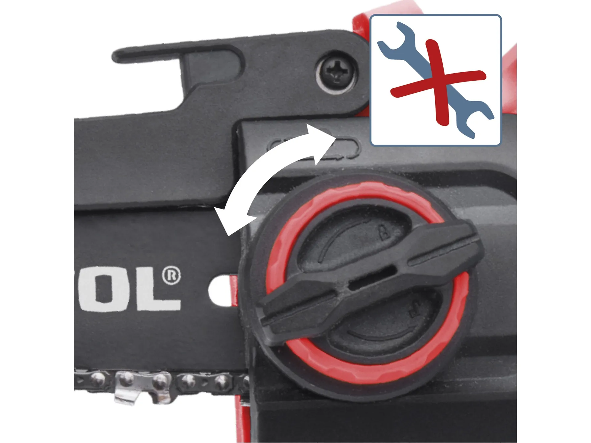 - Jednoruční řetězová aku pila je určena k prořezávání stromů a keřů a pro drobné zkracovací řezy dřeva na zahradě, v dílně apod. Aku řetězová pila spojuje výhody elektrických pil – nízký hluk, jednoduchost obsluhy a údržby se svobodou pohybu u benzínových pil. Tato malá aku pila váží jen 1,8kg a je dostatečně robustní na to, aby si snadno poradila s větvemi, ale zároveň dostatečně lehká na to, aby se dala ovládat jednou rukou. Je vybavena kvalitní vodící lištou a pilovým řetězem. Pila má také systém pro snadnou a rychlou výměnu řetězu a mechanismem pro jednoduché vypnutí řetězu. Vysokou bezpečnost zajišťují tři prvky: horní chránič řetězu, chránič rukou, který vás chrání před pořezáním, poškrábáním a škrábanci a spínačem s pojistkou zabraňující náhodnému spuštění. Pogumovaná rukojeť brání vysmeknutí, tlumí vibrace a zpříjemňuje držení při práci. Akumulátor je vybaven ukazatelem nabití, což umožňuje uživateli si rozvrhnout délku práce a dát si včas nabít další akumulátor. Pro běžnou práci dostačují jeden nebo dva 2Ah akumulátory, které můžete rychle nabít v rychlonabíječce, pro náročnější nebo delší práci doporučujeme větší akumulátory s kapacitou 4–8Ah. Akumulátor lze použít ve všech typech nářadí řady EXTOL SHARE20V. Díky použité Li-ion technologii je ho možné kdykoliv dobíjet, aniž by se tím snižovala jeho kapacita. Li-ion akumulátor ztrácí energii vlivem samovybíjení velmi pomalu a vydrží dlouho nabitý a připravený k použití.