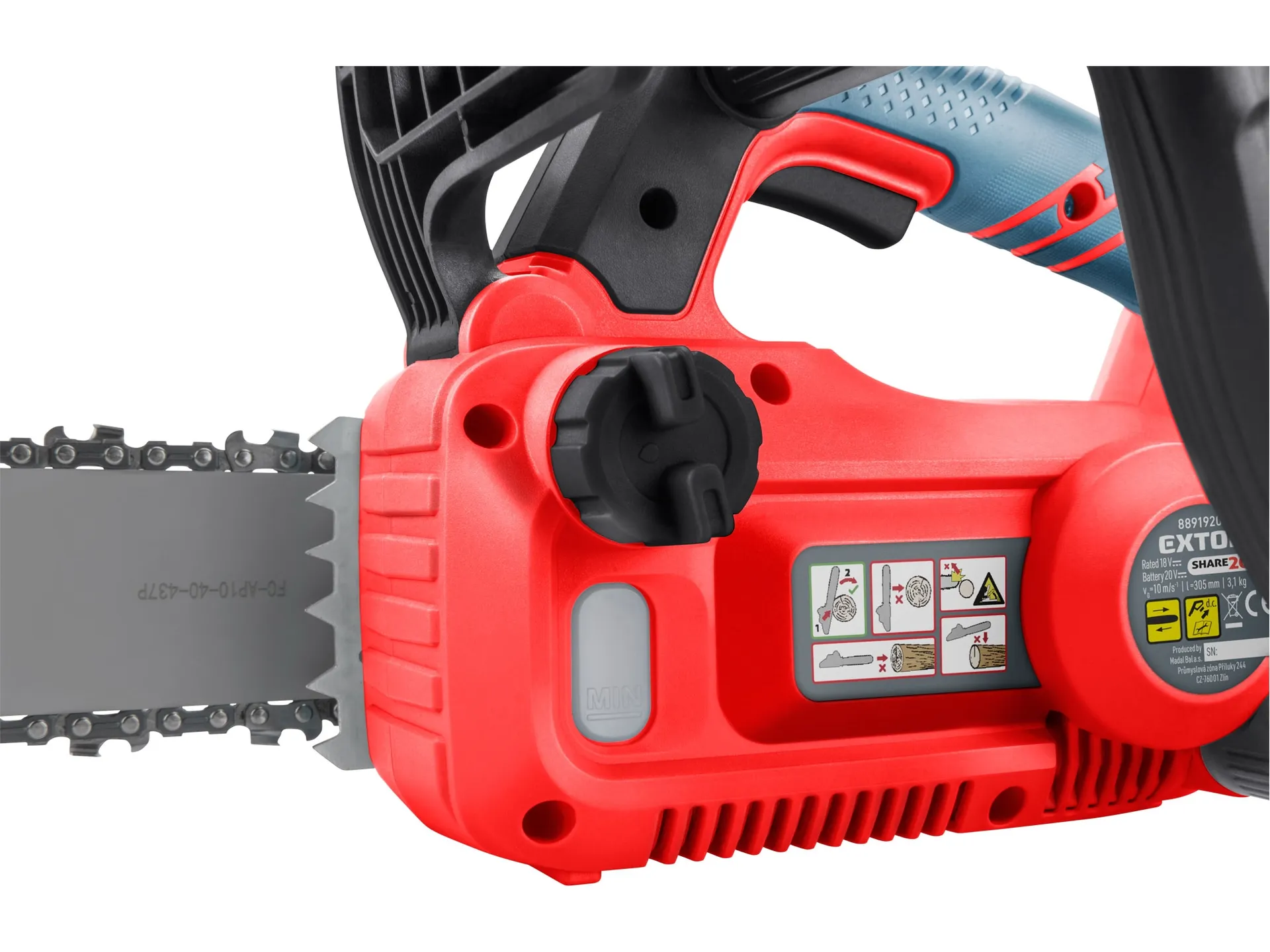 - Řetězová aku pila je určena k provádění zkracovacích řezů dřeva, jako je např. řezání trámů, kácení stromů s přiměřeně silným kmenem, k odvětvování kmenů, k řezání kmenů či silných větví na palivové dřevo. Aku řetězová pila spojuje výhody elektrických pil — nízký hluk, jednoduchost obsluhy a údržby se svobodou pohybu u benzínových pil. Je vybavena kvalitní vodící lištou a pilovým řetězem. Mazaní řetězu za chodu je automaticky zajišťováno čerpadlem. Pohon zajišťuje nejmodernější „brushless" motor. Tento nový typ motoru má vyšší životnost, je výkonnější a má menší spotřebu el. energie než klasické motory s uhlíkovými kartáči. Vysoký výkon brushless motoru se velmi dobře využije při zpracování dřeva, kdy dovoluje chod pily i při rychlejším řezání. Pila je také vybavena systémem pro snadnou a rychlou výměnu řetězu a mechanismem pro jednoduché vypnutí řetězu. Vysokou bezpečnost zajišťuje bezpečnostní pojistka, která se aktivuje při vyklouznutí z rukou nebo při “kopnutí” pily a elektronickou doběhovou brzdou, která zajistí jeho rychlé zastavení. Pogumovaná rukojeť brání vysmeknutí, tlumí vibrace a zpříjemňuje držení při práci. Na spodní straně pily je otvor pro jednoduché zavěšení na zeď. Akumulátor je vybaven ukazatelem nabití, což umožňuje uživateli si rozvrhnout délku práce a dát si včas nabít další akumulátor. Pro běžnou práci dostačují jeden nebo dva 2Ah akumulátory, které můžete rychle nabít v rychlonabíječce, pro náročnější nebo delší práci doporučujeme větší akumulátory s kapacitou 4–8Ah. Akumulátor lze použít ve všech typech nářadí řady EXTOL SHARE20V. Díky použité Li-ion technologii je ho možné kdykoliv dobíjet, aniž by se tím snižovala jeho kapacita. Li-ion akumulátor ztrácí energii vlivem samovybíjení velmi pomalu a vydrží dlouho nabitý a připravený k použití.
