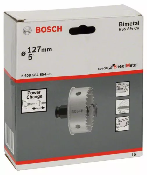 - Děrovka Special for Sheet Metal je vybavena jedinečným výměnným adaptérem Power Change firmy Bosch s nejrychlejším upínacím systémem na trhu.