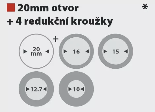 - 4 redukční kroužky 16mm / 15mm / 12,7mm / 10mm