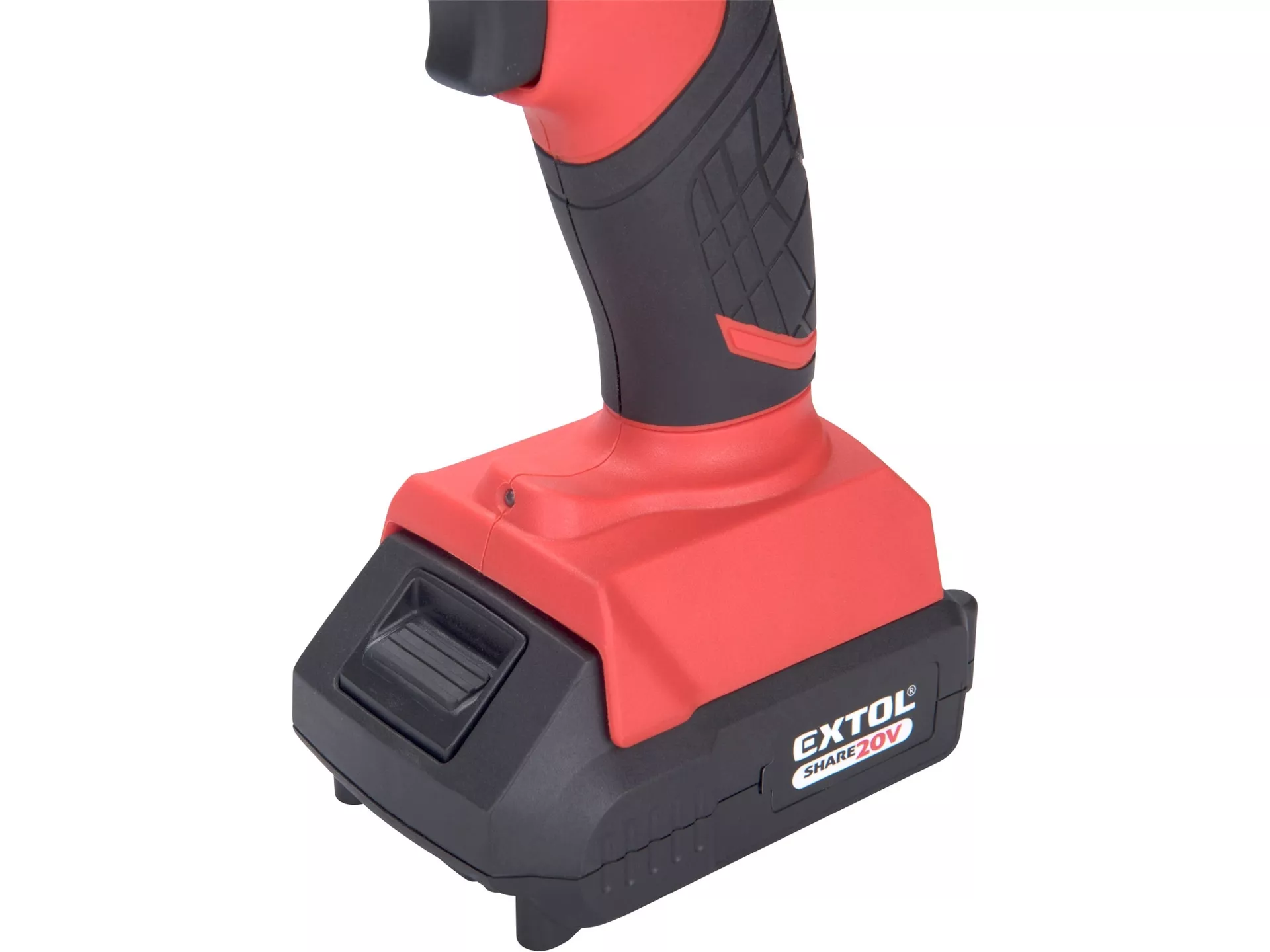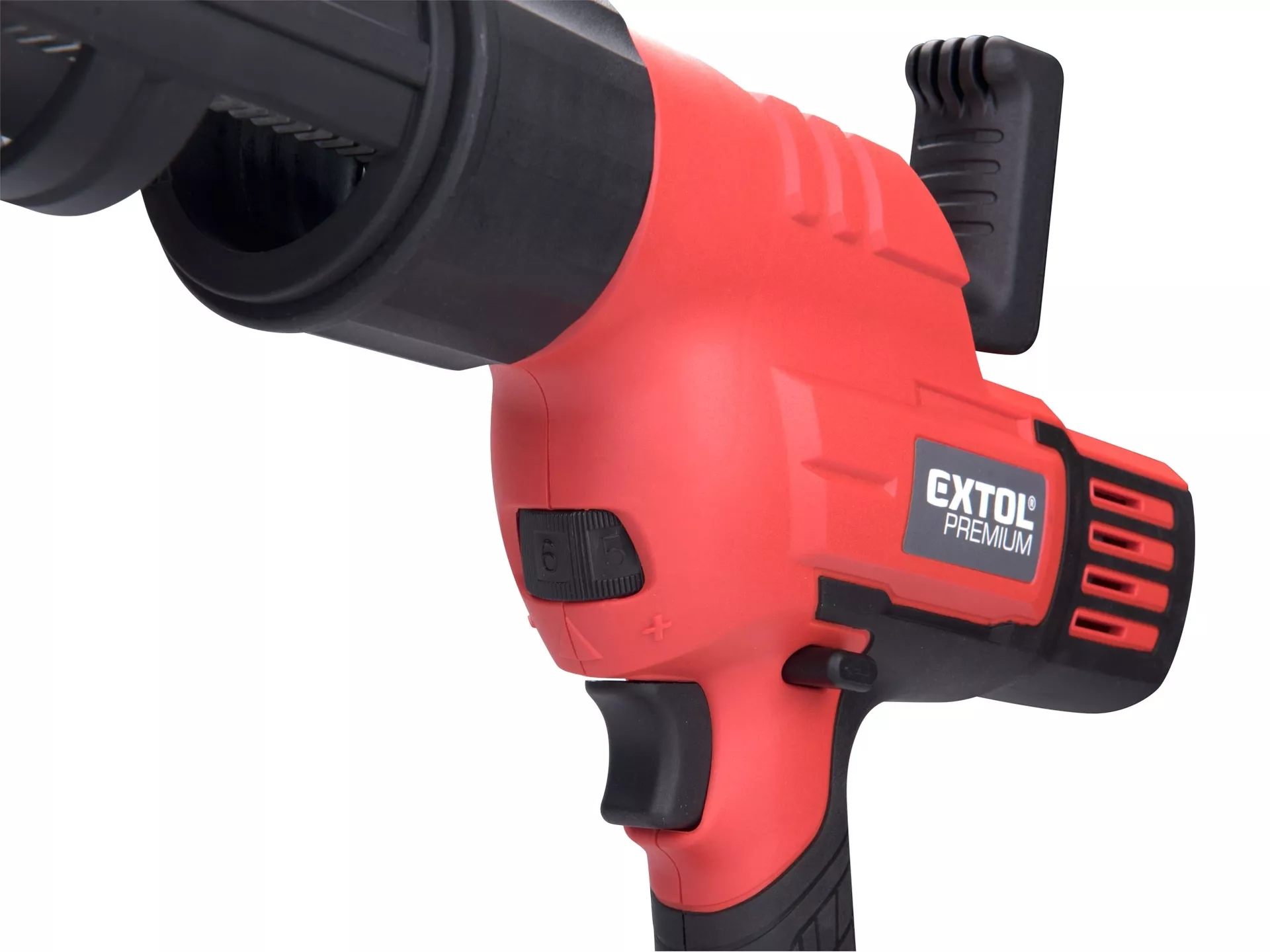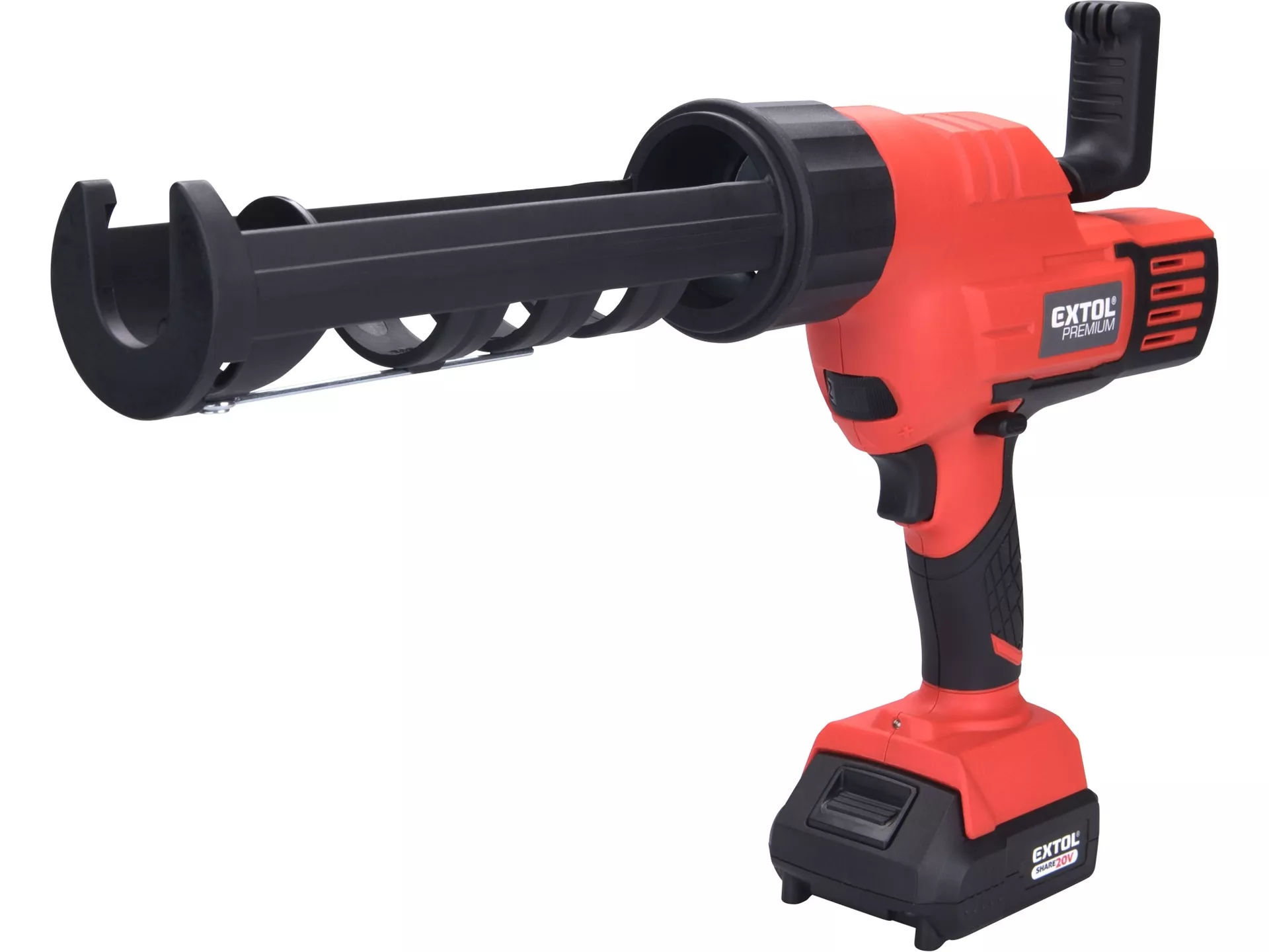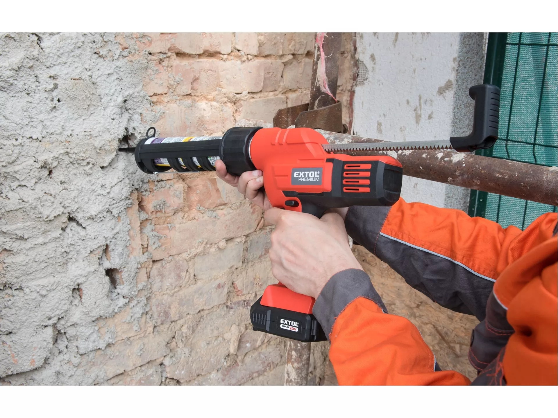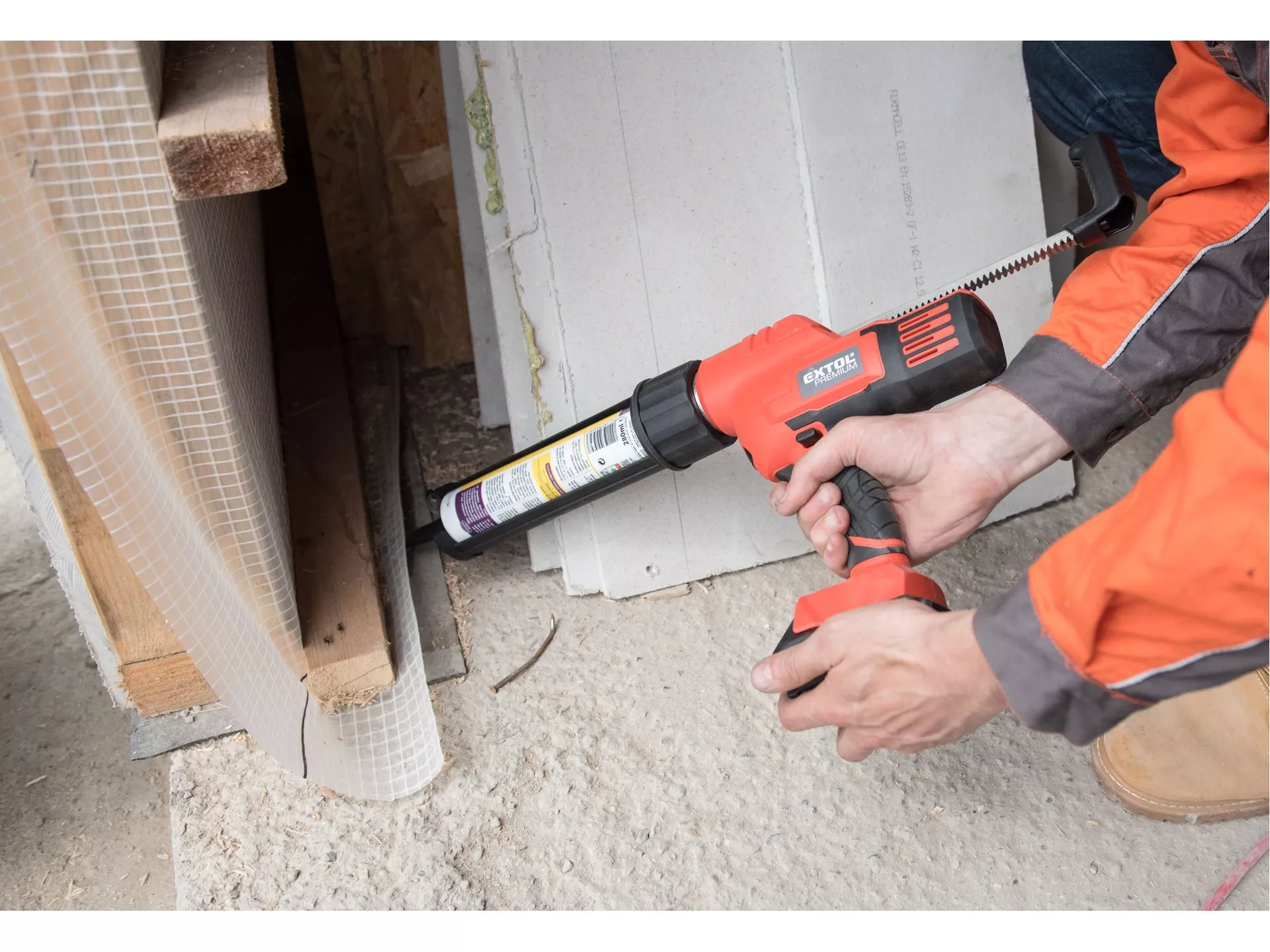 - Aku vytlačovací vaničková pistole je určena k vytlačování silikonu, chemických kotev apod. z kartuší. Rychlost posuvu lze nastavit na 6polohovém regulátoru v rozsahu 50-560mm/min, což umožňuje přesnou regulaci toku hmoty. Silný motor a převody vyvinou tlak až 2000N tlačné síly. Pistole má funkci ANTI-DRIP, která po zastavení pistole automaticky popojede nazpátek a díky tomuto uvolnění tlaku v tubě, nepokračuje vytlačování hmoty. Pro zrychlení práce není zpětný chod motorizovaný, ale jen rychle povytáhnete píst. Vaničku je možno otočit v rozsahu 360°. Stroj je vybaven ochrannou proti přetížení. Rukojeť je pokryta měkkou protiskluzovou gumou, která snižuji vibrace a dobře se drží. Přímo nad baterií je umístěno osvětlení, které osvětluje pracovní místo. Pro běžnou práci dostačují jeden nebo dva 2000mAh akumulátory, které můžete rychle nabít v rychlonabíječce, pro náročnější nebo delší práci doporučujeme větší akumulátory s kapacitou 4000–8000mAh. Akumulátor lze použít ve všech typech nářadí řady EXTOL SHARE20V. Díky použité Li-ion technologii je ho možné kdykoliv dobíjet, aniž by se tím snižovala jeho kapacita. Li-ion akumulátor ztrácí energii vlivem samovybíjení velmi pomalu a vydrží dlouho nabitý a připravený k použití.