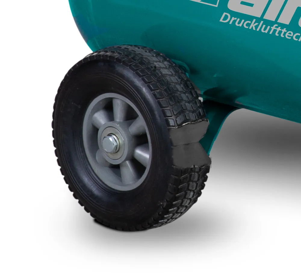 - Stabilní řiditelný podvozek s parkovací brzdou ve spojení s velkými koly z PU pěny zabraňující defektu umožňují pohodlnou přepravu bez nutnosti kompresor nadzvedávat