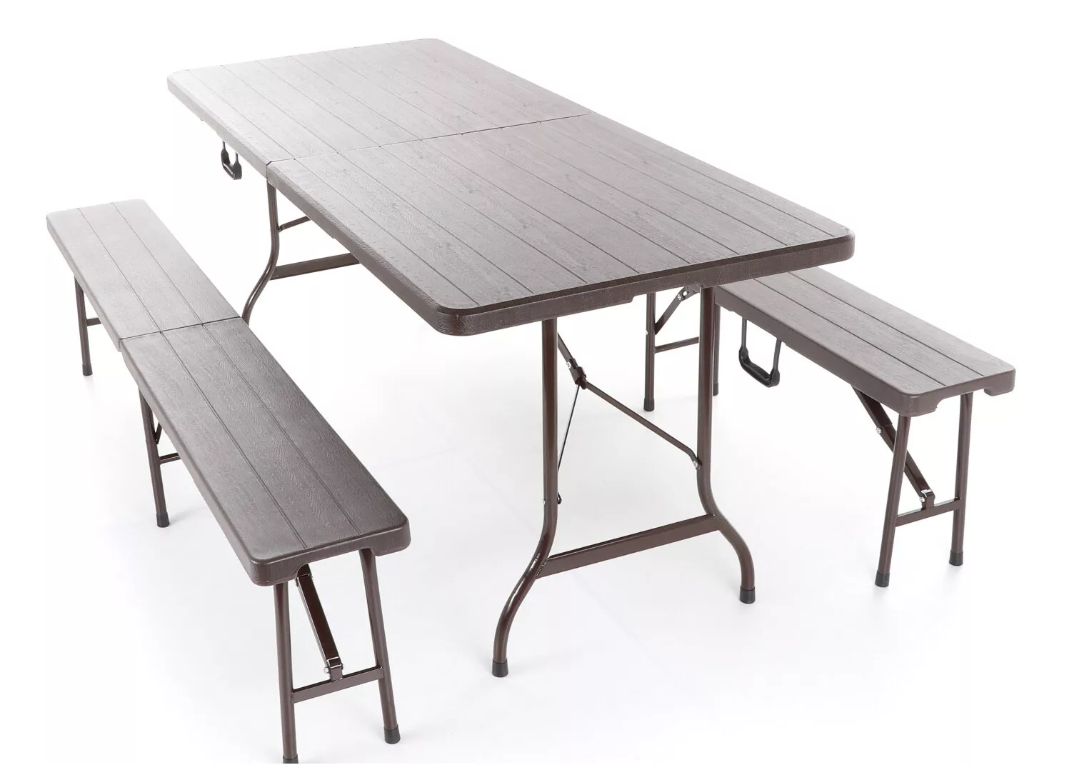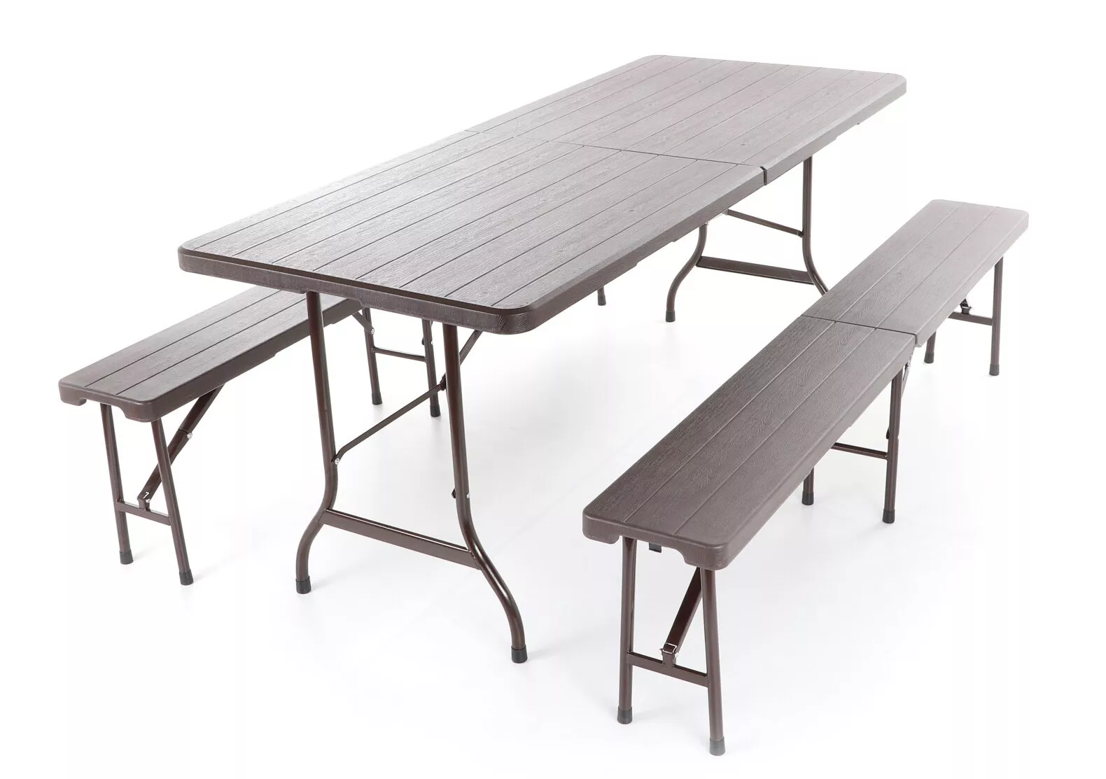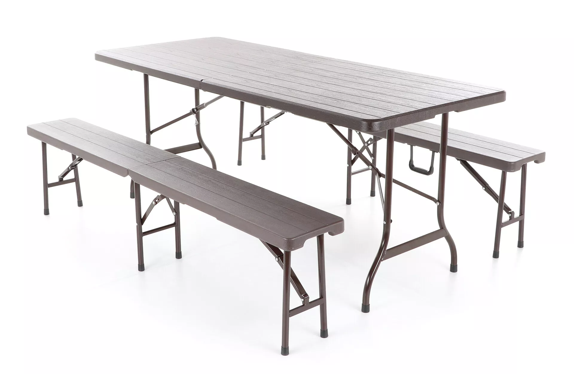 - Stolová sestava s dvěma skládacími lavicemi z ocelových profilů povrchově dokončena komaxitovou barvou , čalounění je v imitaci masivního dřeva z lisovaného plastu s UV filtrem , určená do interiérů, exteriérů a pergolových prostor.