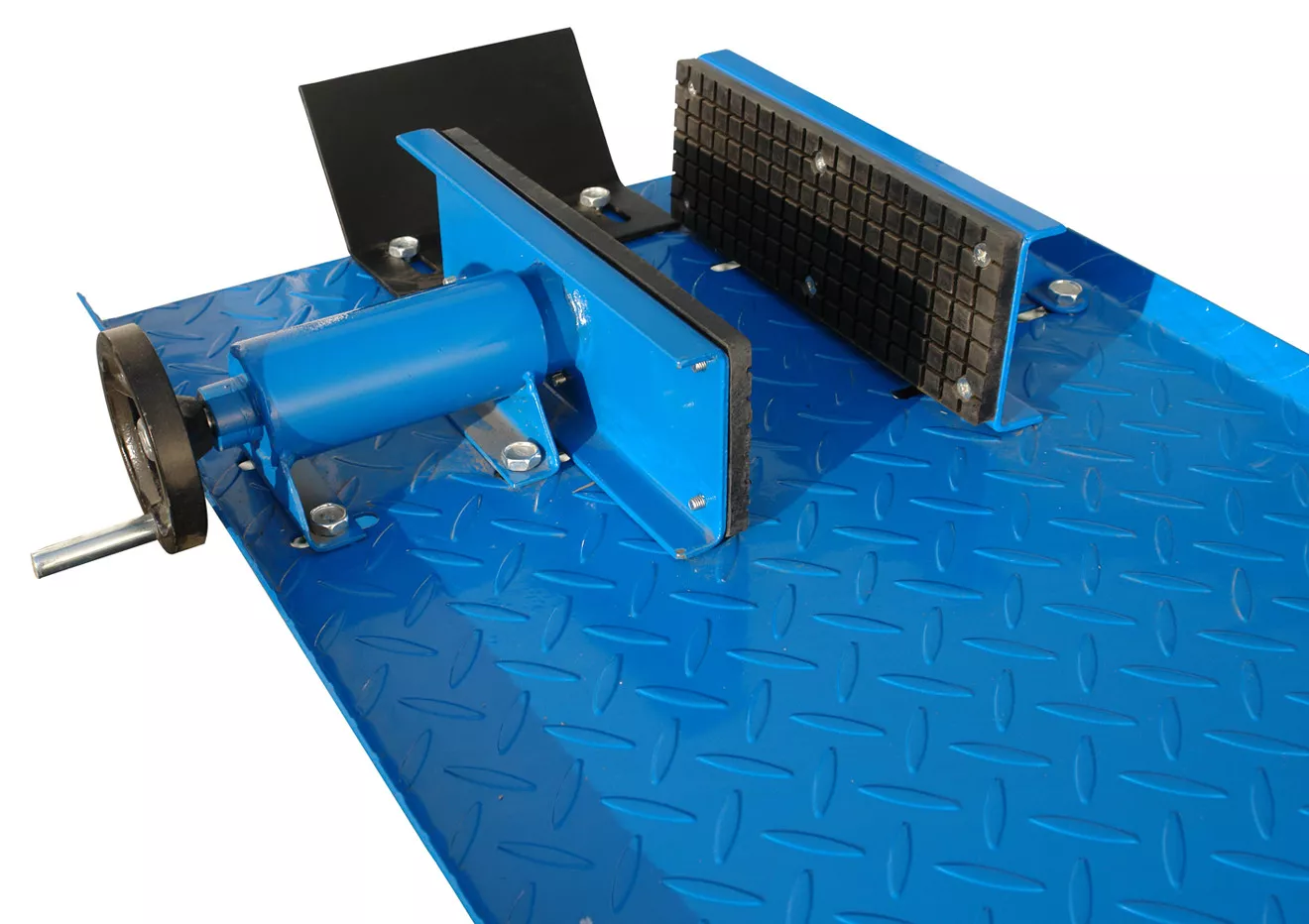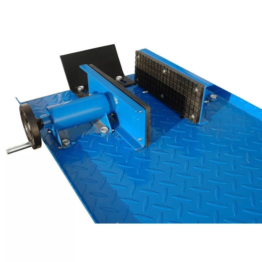 - (-> maximální nosnost: 360 kg).Pohodlné zvedání/plynulé spouštění plošiny pomocí pedálů (2), bezpečná fixace předního kola motocyklu prostřednictvím pohyblivé upínací svorky (-> max