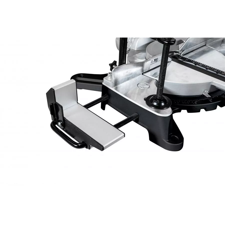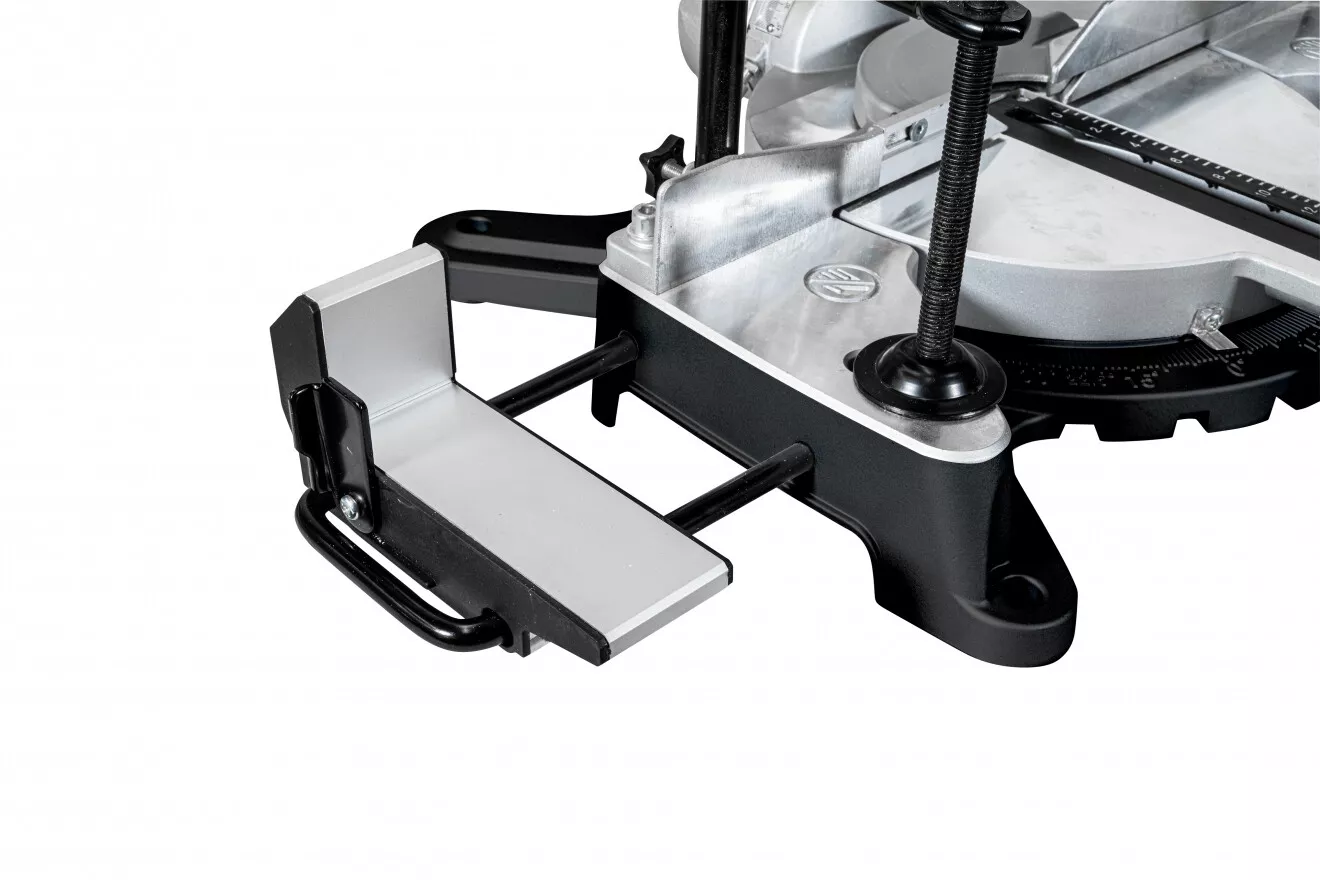 - Laserový ukazatel linie řezu • výsuvné opěrky pro řezání rozměrných obrobků • otočný pracovní stůl s úhlovou (centimetrovou) stupnicí