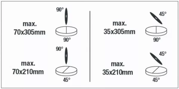 - Dodaný sáček na prach shromažďuje nečistoty, takže můžete pracovat v uklizeném a čistém pracovním prostředí bez pilin. ŘEZNÁ KAPACITA 90st - 90st - 70 x 305 mm 45st (vlevo) - 90st - 70 x 210 mm 90st - 45st - 35 x 305 mm 45st (vlevo) - 45st - 35 x 210 mm